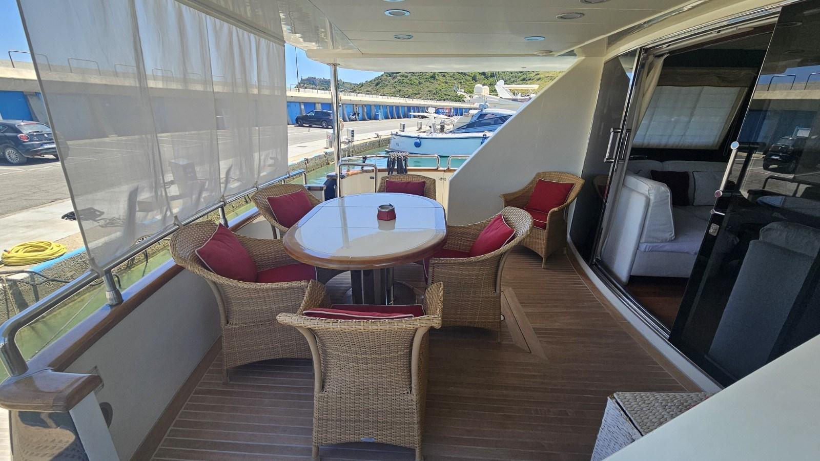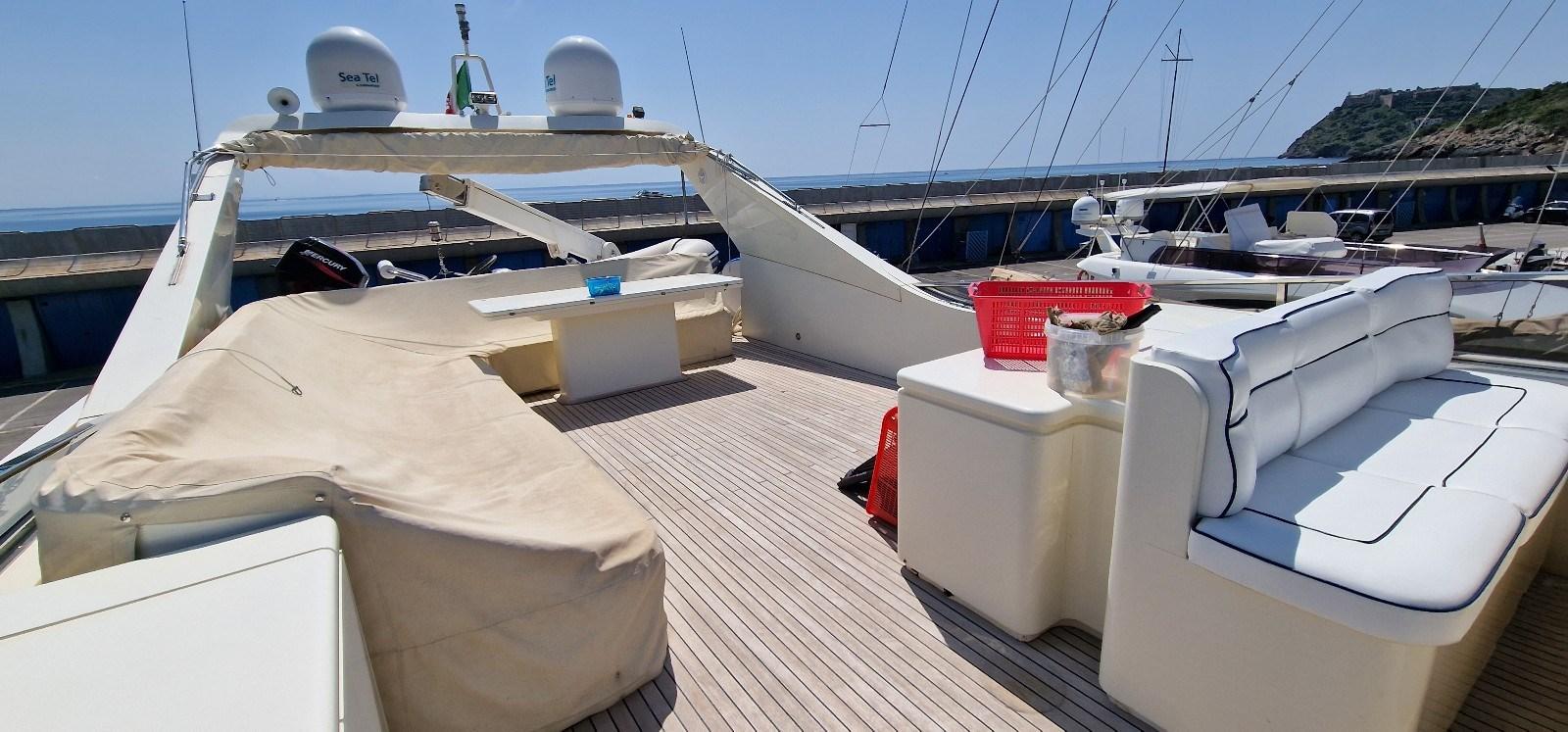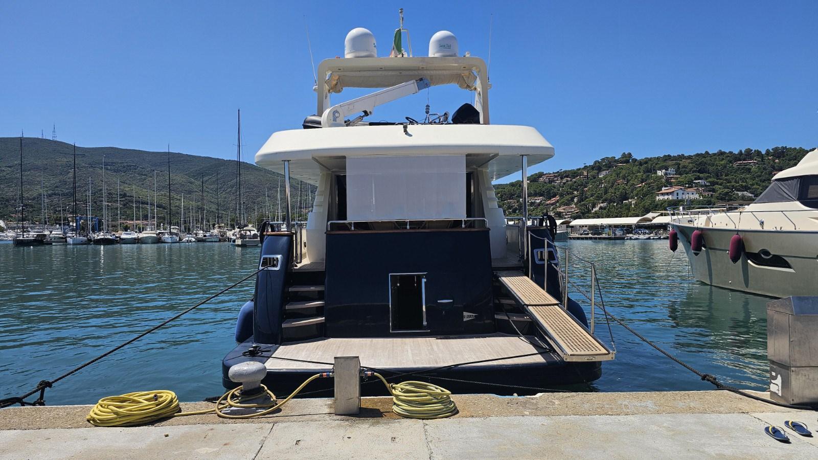 Engine Alarm, Bilge Alarm, Water pressure pump, Draining System, Deck Shower, Twin Steering, Hydraulic Flaps, Davits for tender on fly, Fire Extinguishing System, Courtesy Lights, Gangway, Platform, Entry door, Side door, Teak Cockpit, Shorepower connector, Water harbor connector system, Rollbar, Electric Windlass, swimming ladder, Saddles for tender, cockpit table, Tender, Horn, Stern Winches.