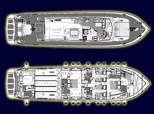 Master cabin with double bed, bathroom and walk-in closet - VIP cabin with two flat beds and bathroom - guest cabin with two flat beds, third foldaway bed and bathroom - guest cabin with two flat beds, third foldaway bed and bathroom.