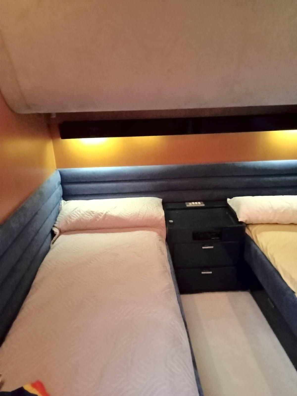 Master cabin with double bed and bathroom - guest cabin with two flat beds and bathroom - guest cabin with two L-shaped beds and bathroom.