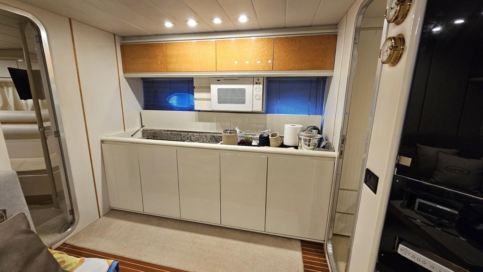 Electric bow thruster - Besenzoni electro-hydraulic gangway - Raymarine SAT TV antenna - LCD TV - tender with outboard - 3.5 kW EMI generator - inverter - wet bar in the cockpit with sink and two-burner electric hob - electric hob - microwave combi oven - Vitrifrigo fridge and icebox in the cockpit - hydraulic cockpit table - hand shower at the stern, cockpit and bow - hydraulic and manual steel bathing ladder.