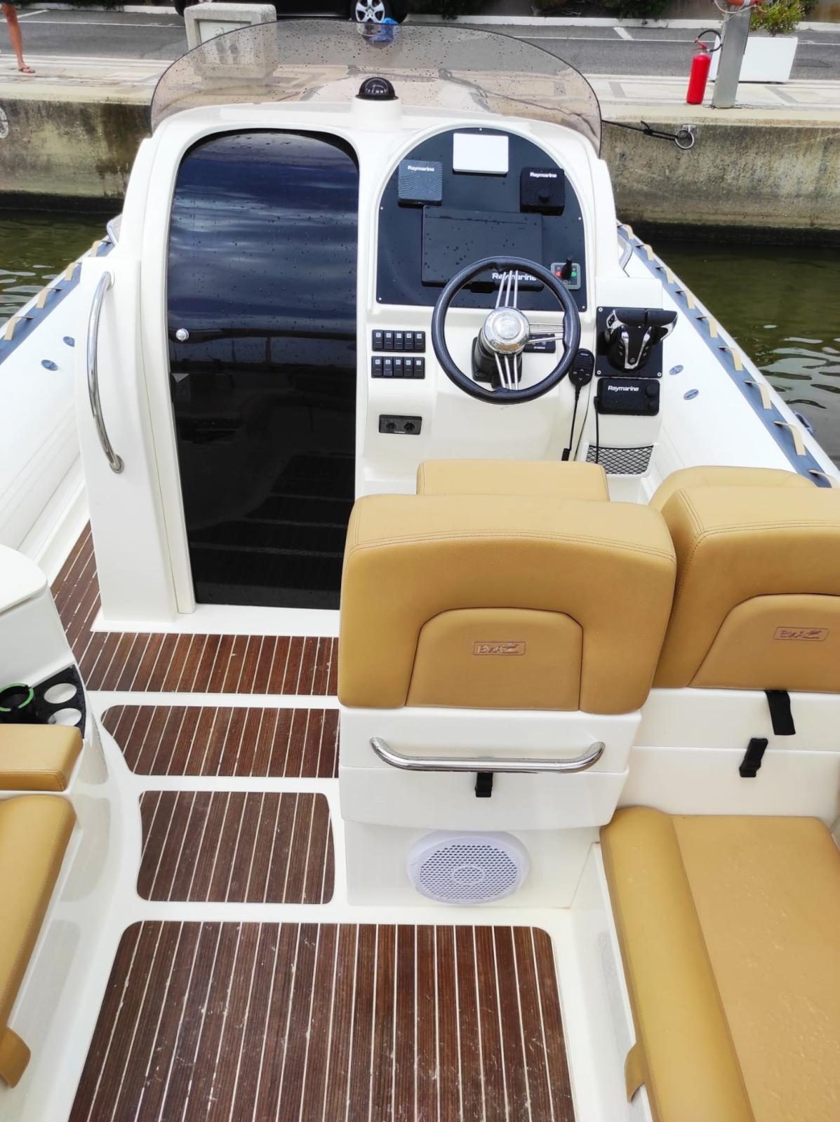 Electric winch - bow thruster - teak cockpit - sun cushions - bimini - outdoor cabinet with sink and refrigerator - stern platforms - underwater lights - Fusion stereo system.