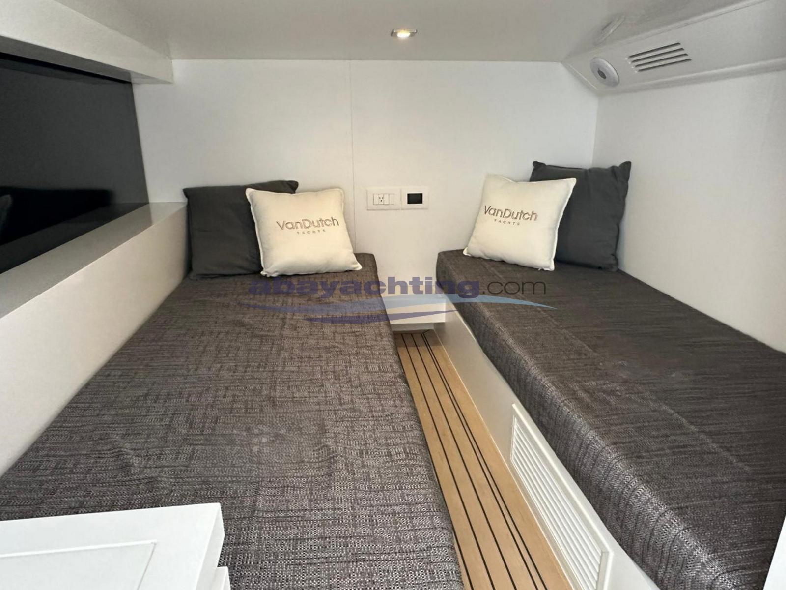 Van Dutch 48 with upgraded Volvo Penta D11 725hp in-line shaft motorisation with joystick control. Full optional: 8.5 kw generator, Side Power stern thruster + bow thruster, hydraulic stern platform with lift system, reversible air conditioning, foldable and electrically retractable bimini, double external refrigerator + ice-maker, Flexiteek synthetic teak deck, Garmin electronics with two 16" touch screens.