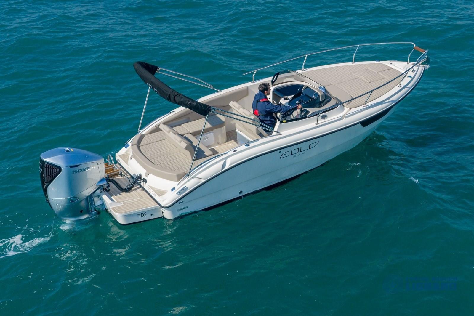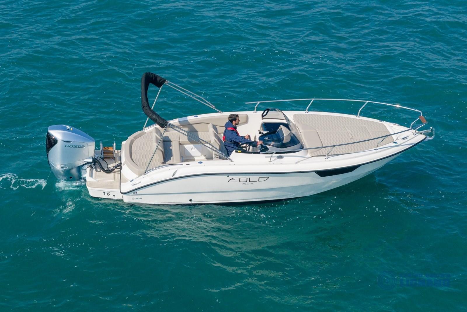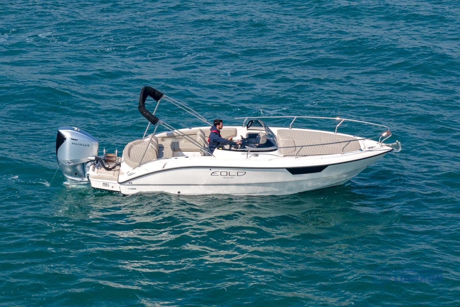Eolo Marine 730 Day Hbs new 2026 immediately ready for delivery at Centro Nautico Lignano complete with Honda Marine BF250 V6 engine 2026 edition new silver color. All new under warranty, technical characteristics overall length 7.30 meters by width 2.54 meters, weight about 1,600 kg, passenger capacity 7 + 1, CE-C category, 2 beds. White hull color and complete luxury beige exterior cushions with Lamborghini texture. Accessories included: 49 lt cockpit fridge, 45 lt water and shower system, 4-arch stainless steel awning, platform flexiteek, steps and cockpit, plexiglass windows, electric anchor and chain winch, electric toilet with black water system, hatch, bow sundeck, windshield handrail, bow roller, bollards, hauling hooks, bow handrail, table with foot, ladder, stainless steel bathroom, 140 lt fuel system, electrical system complete with compass, horn, navigation lights, 360° light, 12 V power socket, bilge pump. Complete new boat that can be completed with other accessories.
