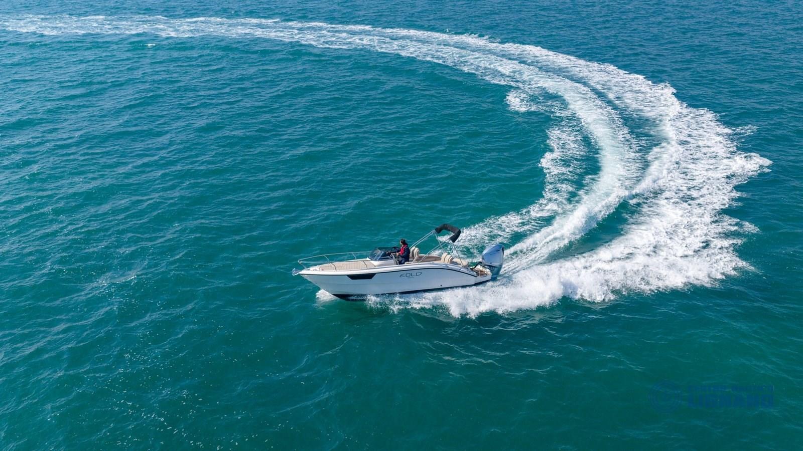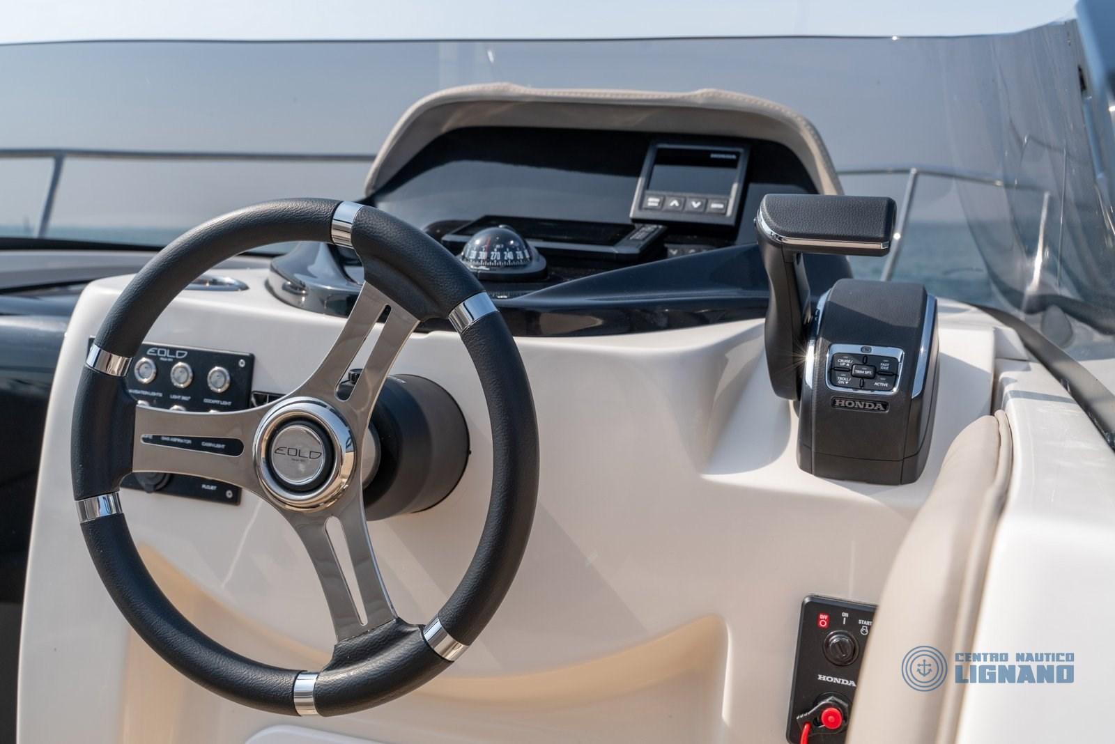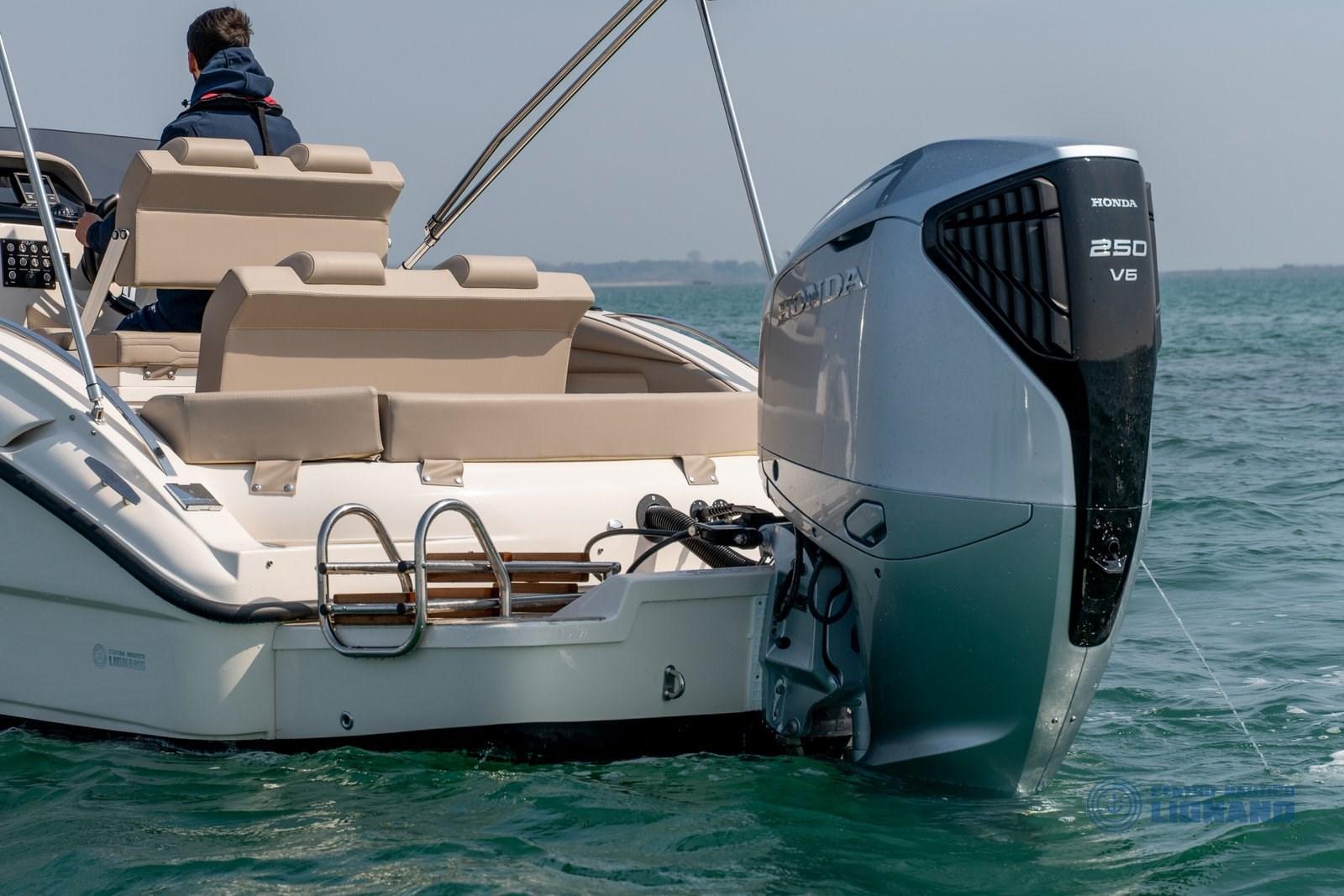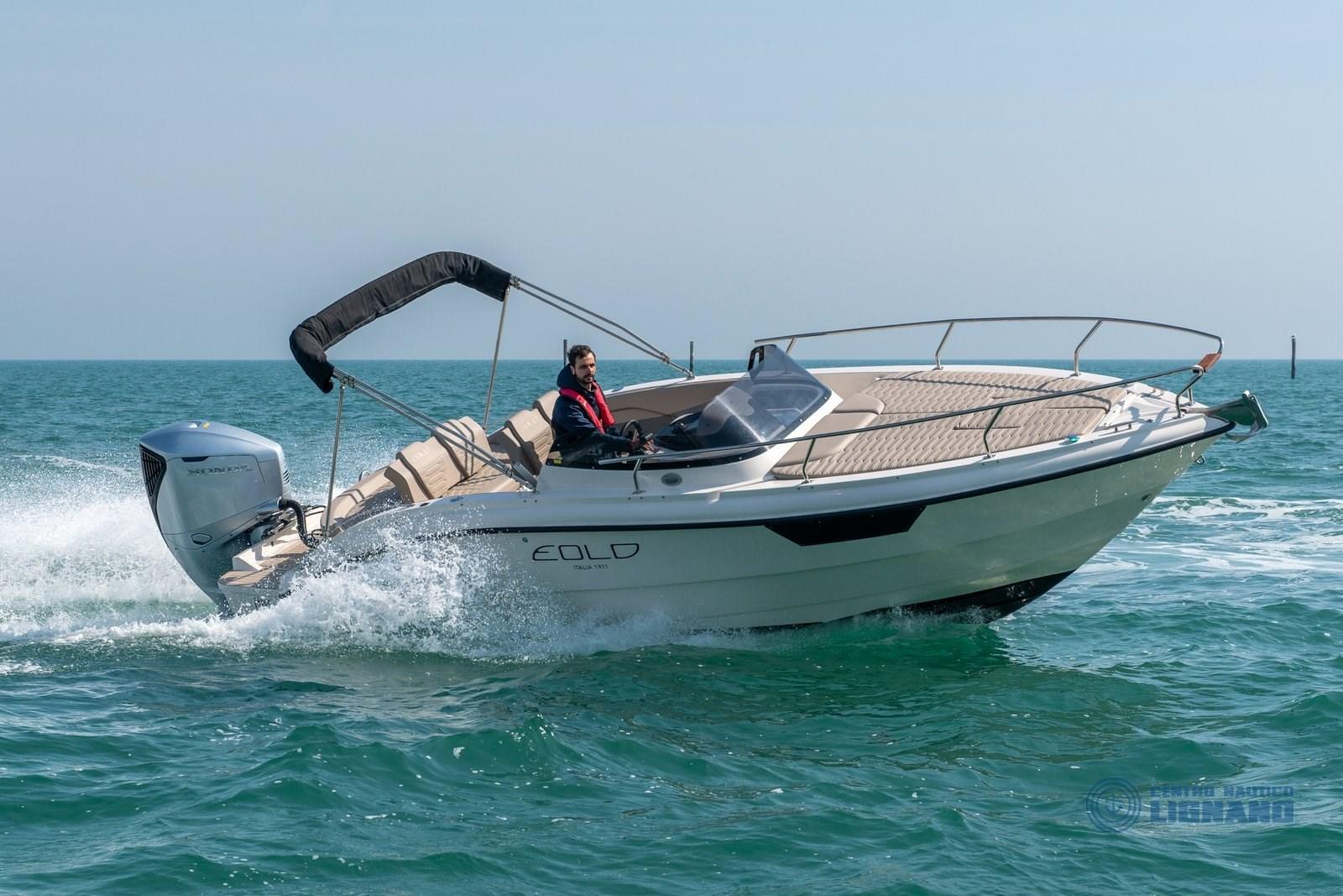 Eolo Marine 730 Day Hbs new 2026 immediately ready for delivery at Centro Nautico Lignano complete with Honda Marine BF250 V6 engine 2026 edition new silver color. All new under warranty, technical characteristics overall length 7.30 meters by width 2.54 meters, weight about 1,600 kg, passenger capacity 7 + 1, CE-C category, 2 beds. White hull color and complete luxury beige exterior cushions with Lamborghini texture. Accessories included: 49 lt cockpit fridge, 45 lt water and shower system, 4-arch stainless steel awning, platform flexiteek, steps and cockpit, plexiglass windows, electric anchor and chain winch, electric toilet with black water system, hatch, bow sundeck, windshield handrail, bow roller, bollards, hauling hooks, bow handrail, table with foot, ladder, stainless steel bathroom, 140 lt fuel system, electrical system complete with compass, horn, navigation lights, 360° light, 12 V power socket, bilge pump. Complete new boat that can be completed with other accessories.
