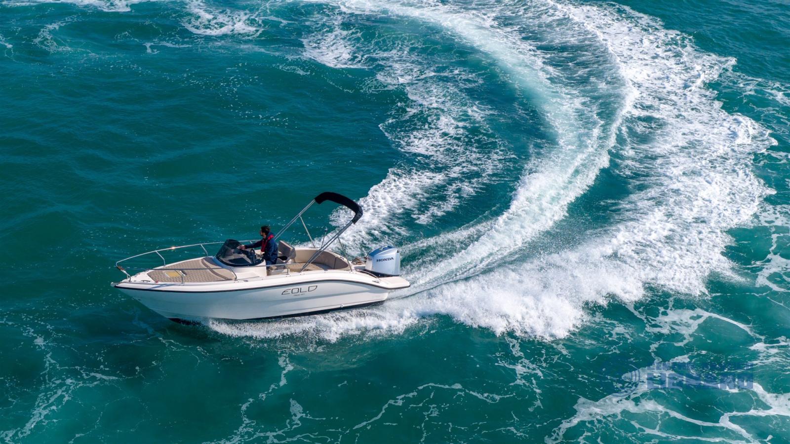 Eolo 6.4 EL 2026 new complete with Honda Marine BF150 silver outboard engine, stainless steel propeller, complete with beige cushions Lamborghini texture, 96 lt fuel system, 39 lt water and shower system, black 3-arch stainless steel awning, manhole, hydraulic steering, stern platforms with climbing ladder, navigation and anchor regulation lights, courtesy lights in the cabin, white hull, bow roller, manual anchor, 12V socket, 12V electrical system with panel, compass, chemical toilet, new Honda Marine BF150 Silver Aquamarine outboard, first SVH85 instrument.
