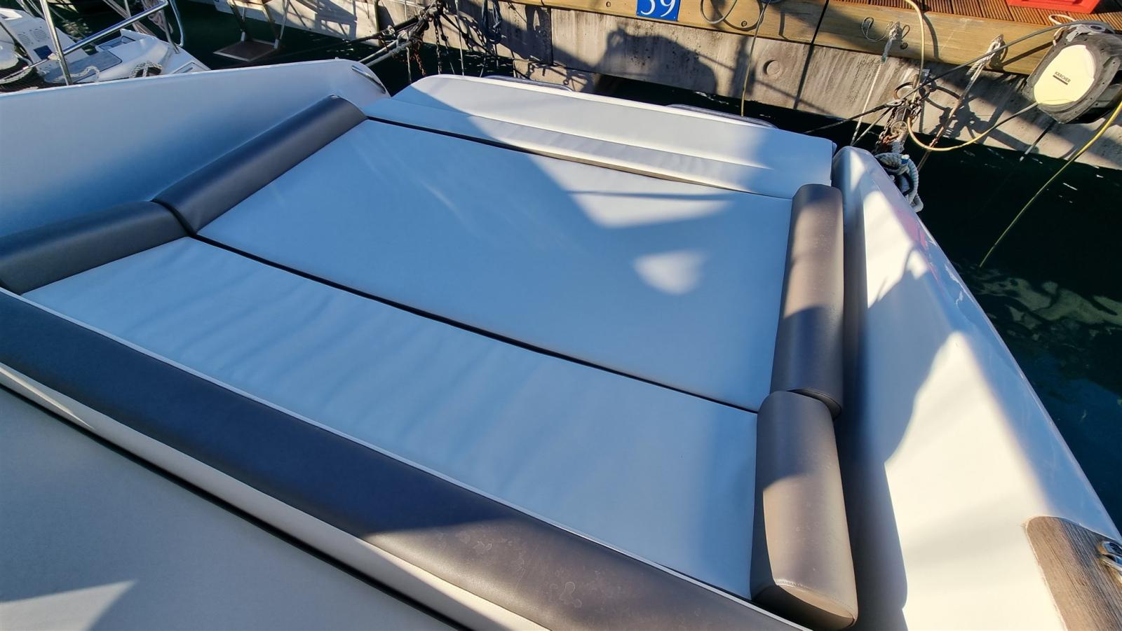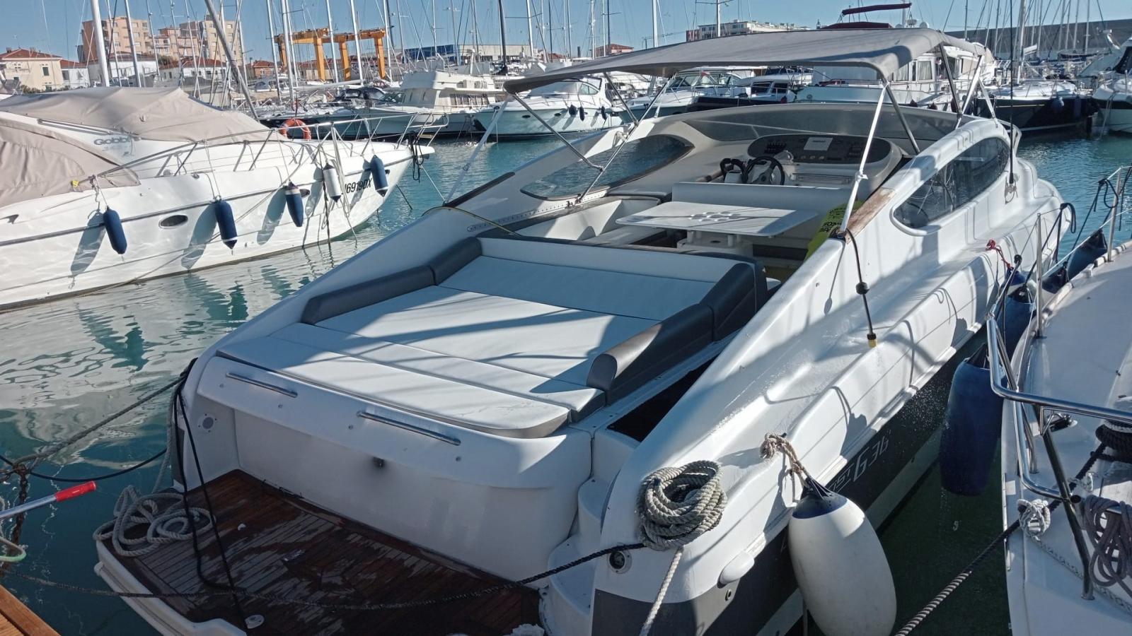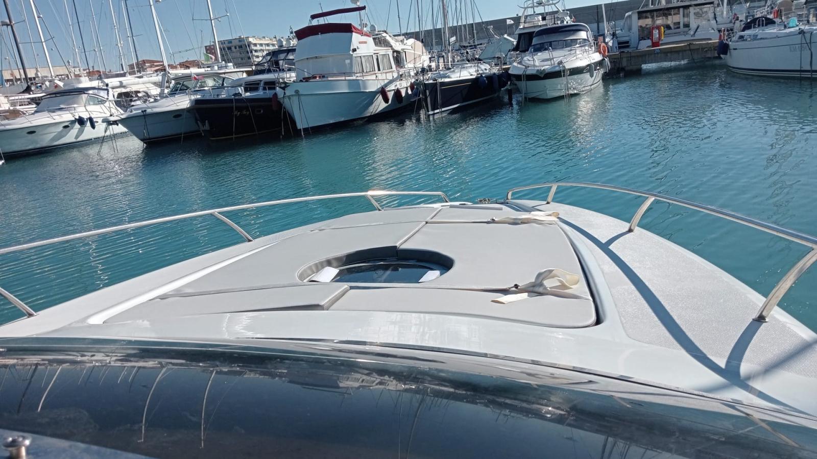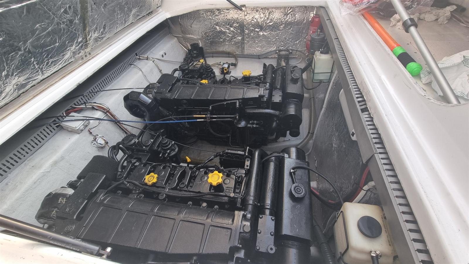boat as new, a major refit was done in 2024: complete hull and deck polishing. repainted the gray side band, anti-vigetetative, bilge cleaning and complete repainting, new side windows, total renovation of the cushions (stern, bow, driver's seat and table sofa in the cockpit, teak sanding in the platform, new awning, new batteries and battery switch, new electric winch, new charger, new cartographic GPS latest generation. New boiler, replacement of all seacocks, replacement of all diesel and water pipes, soundproofing of new engines, new bilge pumps, new kitchen gas pipe, led rgb underwater lights, new dashboard switches, repainted dashboard, new rudder angle, new diesel level instrument, new fusion stereo system, new vhf Engines redone at zero hours, Feet completely overhauled, steel propellers.
