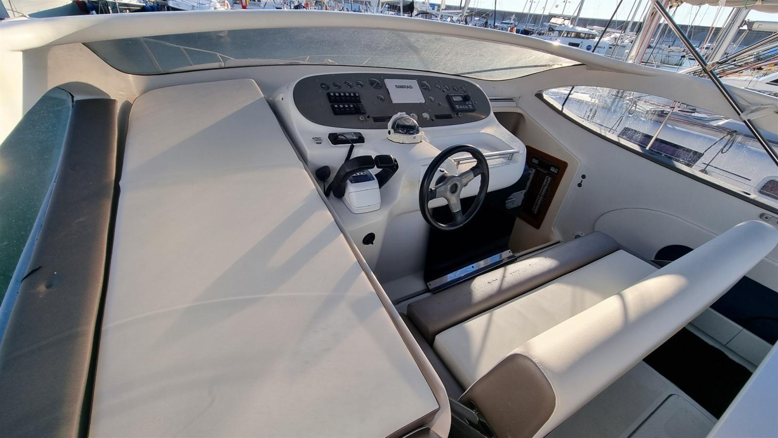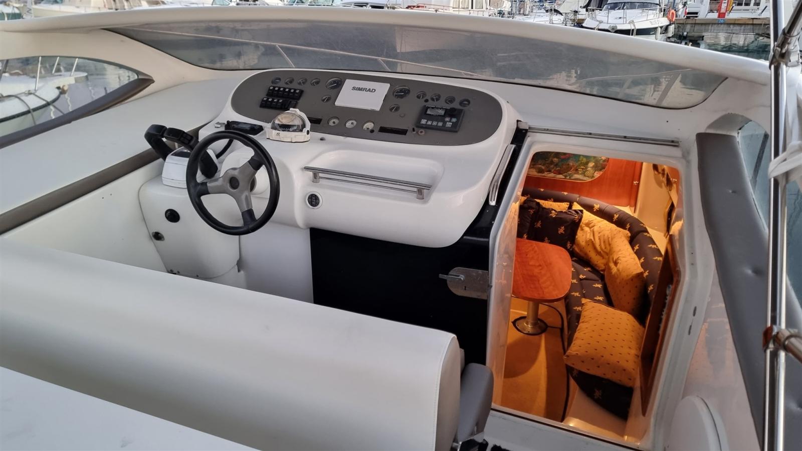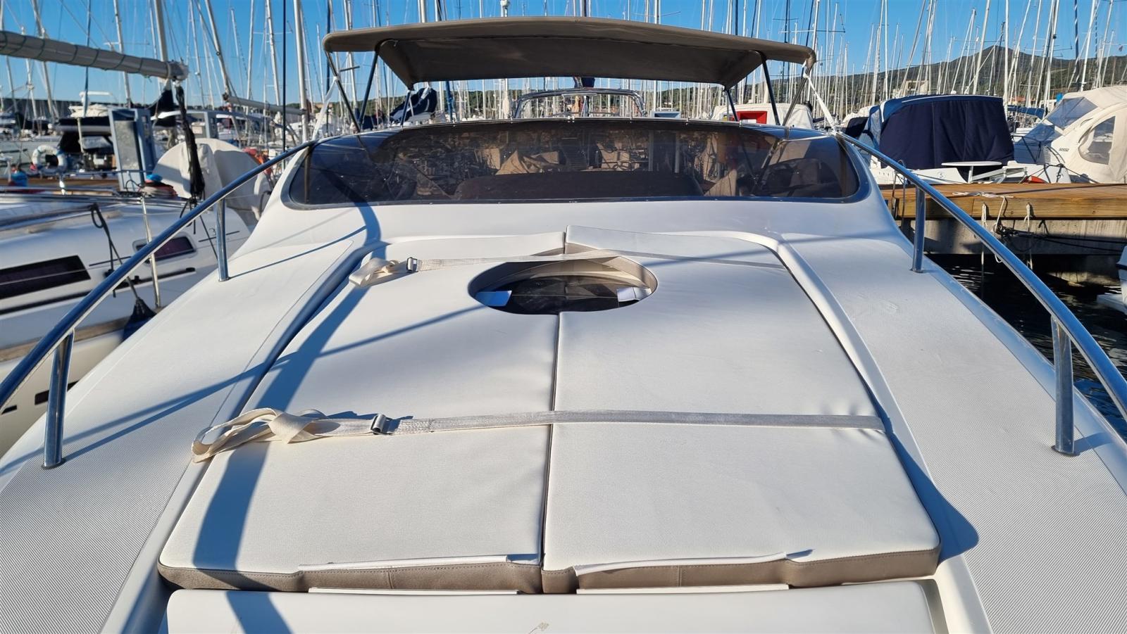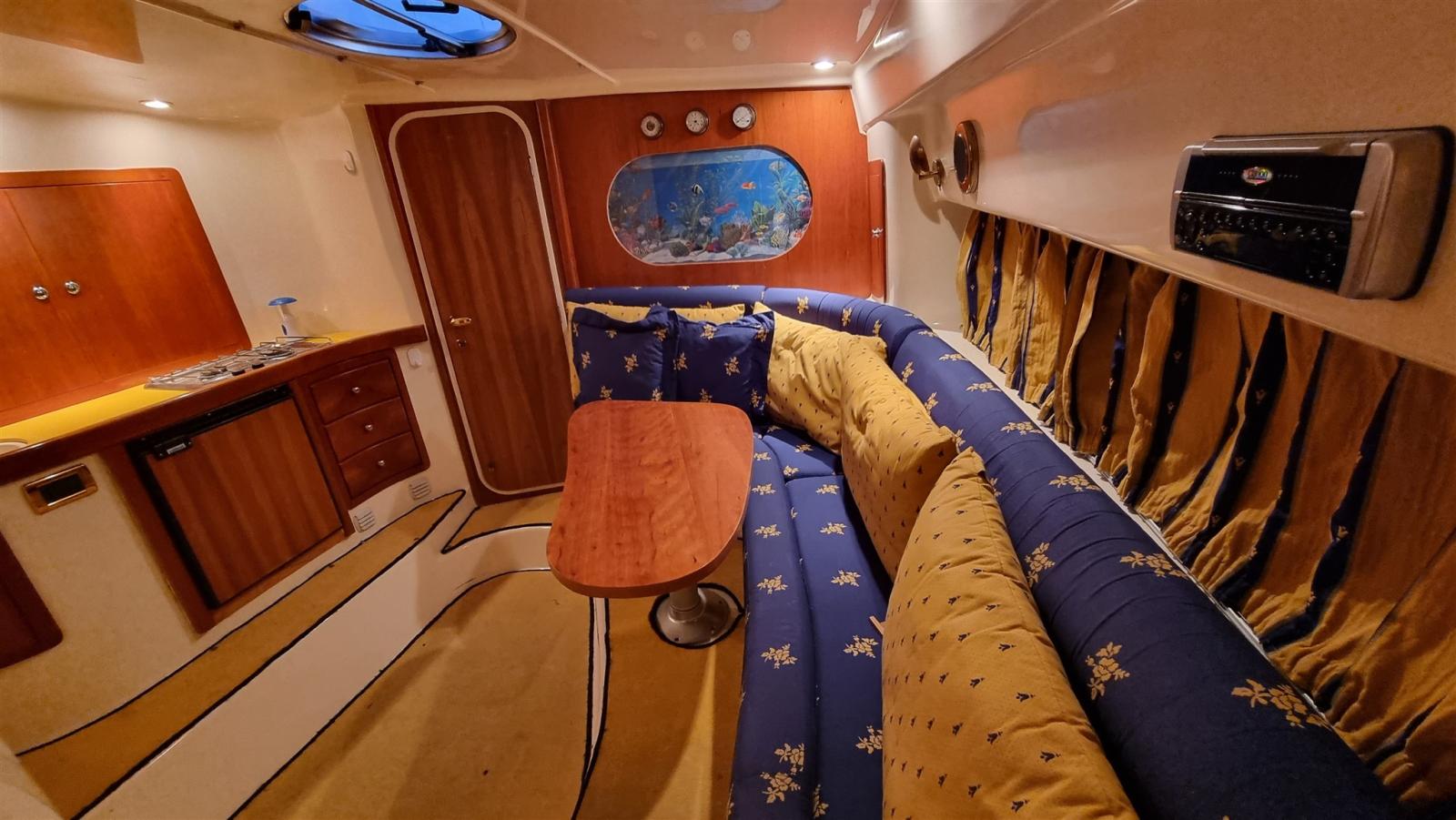 boat as new, a major refit was done in 2024: complete hull and deck polishing. repainted the gray side band, anti-vigetetative, bilge cleaning and complete repainting, new side windows, total renovation of the cushions (stern, bow, driver's seat and table sofa in the cockpit, teak sanding in the platform, new awning, new batteries and battery switch, new electric winch, new charger, new cartographic GPS latest generation. New boiler, replacement of all seacocks, replacement of all diesel and water pipes, soundproofing of new engines, new bilge pumps, new kitchen gas pipe, led rgb underwater lights, new dashboard switches, repainted dashboard, new rudder angle, new diesel level instrument, new fusion stereo system, new vhf Engines redone at zero hours, Feet completely overhauled, steel propellers.