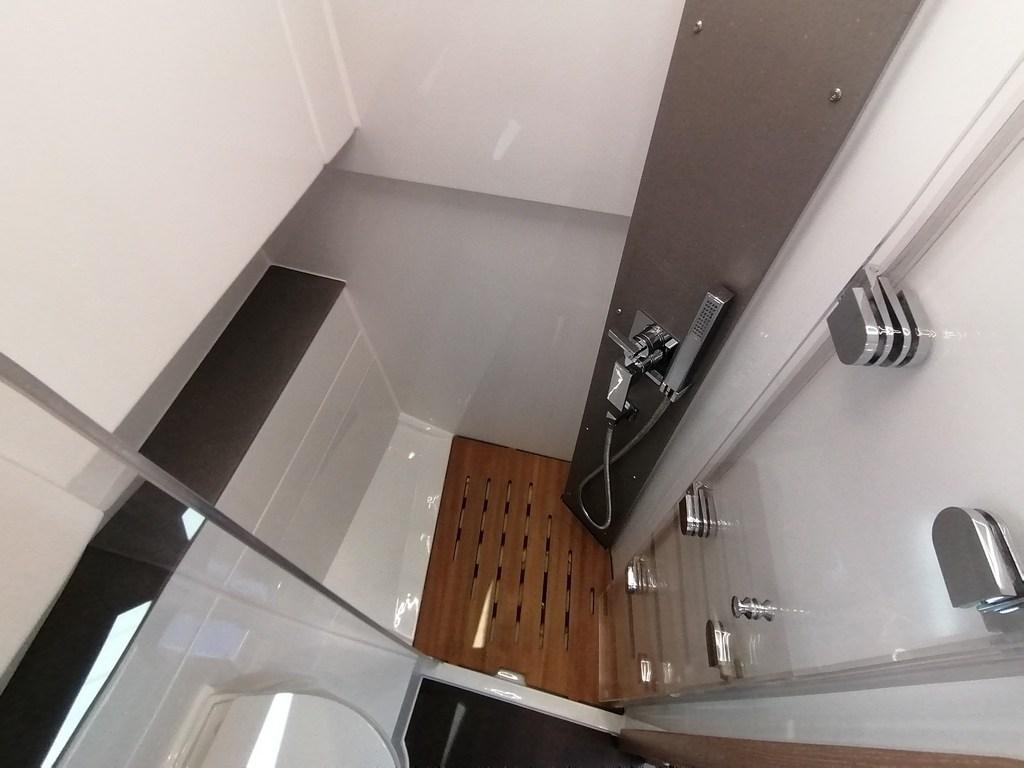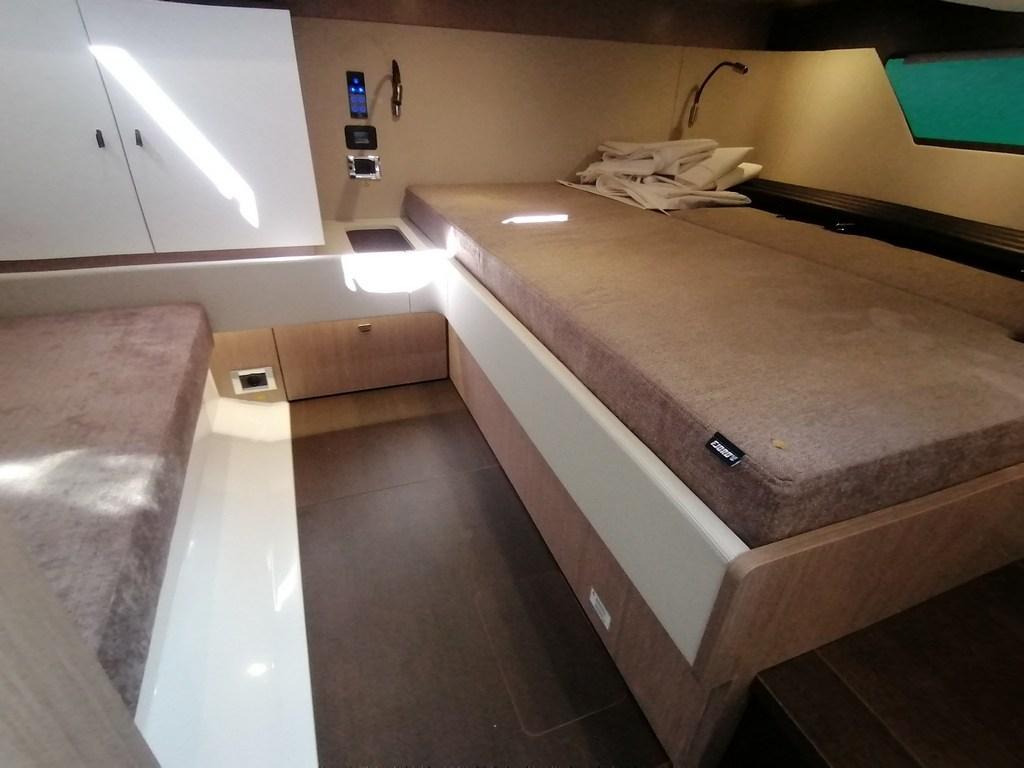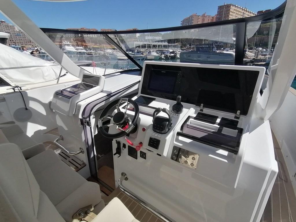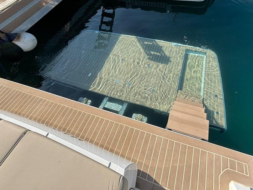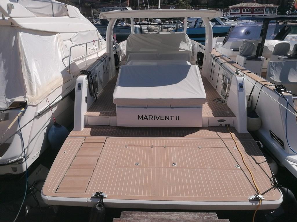 Engine Alarm, Bilge Alarm, 2 Alternator, Deck Suction of Dirty Water, Auto Dynamic Trim Interceptor (with Auto trim, List and Coordinated Turn), Water pressure pump, 4 Batteries (x160Ah AGM service bank), 8 Folding cleats, Draining System, Battery charger (Mastervolt), Shore power cable, Deck Shower, 2 Trim Tabs / Trimflaps, Fire Extinguishing System (fire buoy), Washbasin in the cockpit, Courtesy Lights (Indirect light package: multicolour on handrails on side deck and sunbed and white colour on dashboard), Underwater lights (multicolor), Battery Monitor (Mastervolt), 8 Fenders, Gangway (telescopic hydraulic), Platform (extended hydraulic tender lift), 2 Automatic Bilge Pump, 3 Electric Bilge Pump, Manual Bilge Pump, Teak deck (Flexiteak), Teak deck (synthetic Flexiteak), Entry door (sliding), 2 Shorepower connector, Electric Windlass, swimming ladder (foldbale), Stabilizers (Quick gyro (12V or 230V)), 2 cockpit table, 2 guard rails with gates, Horn, T-Top (Full beam T-Top with windshield frame and wiper cover).