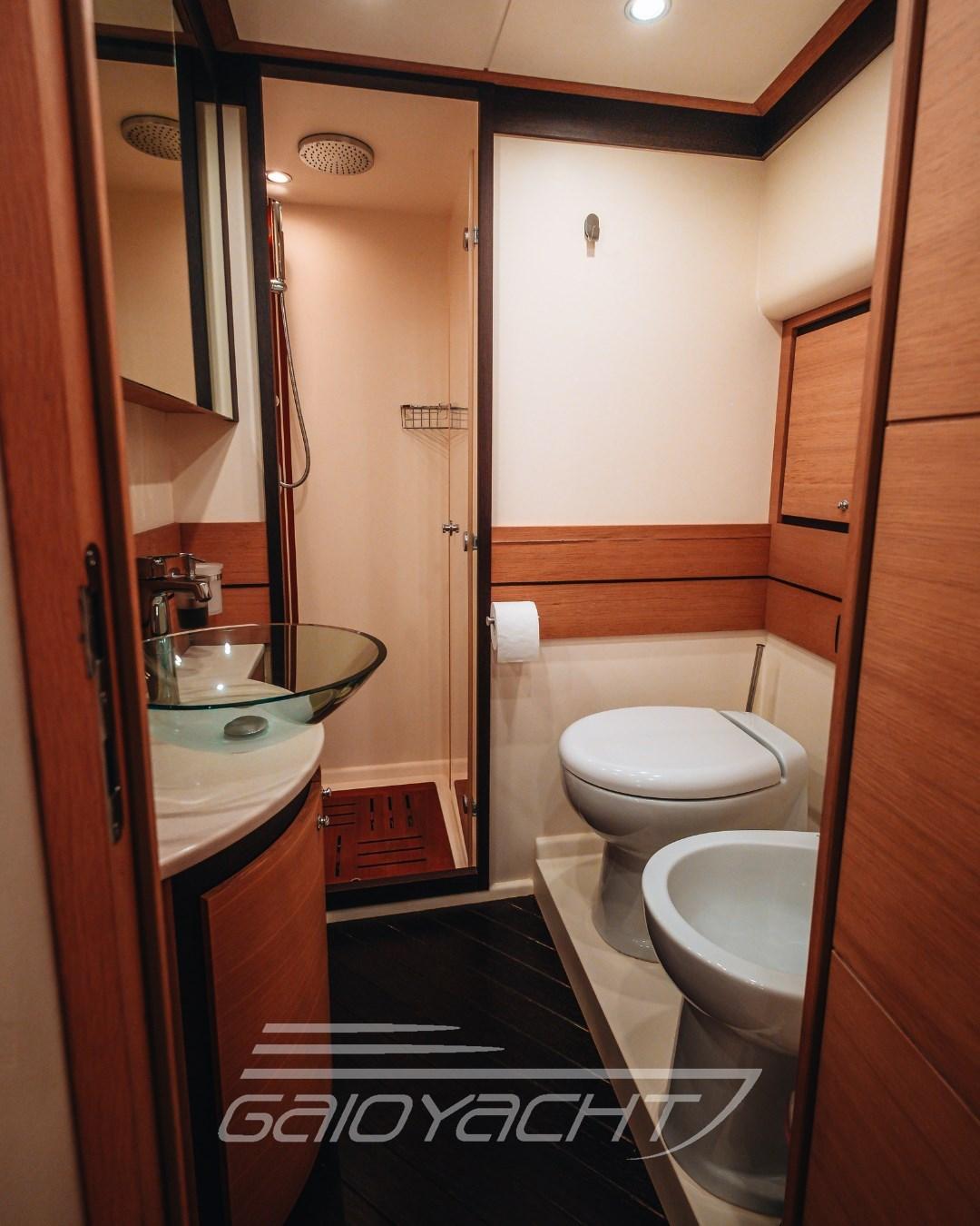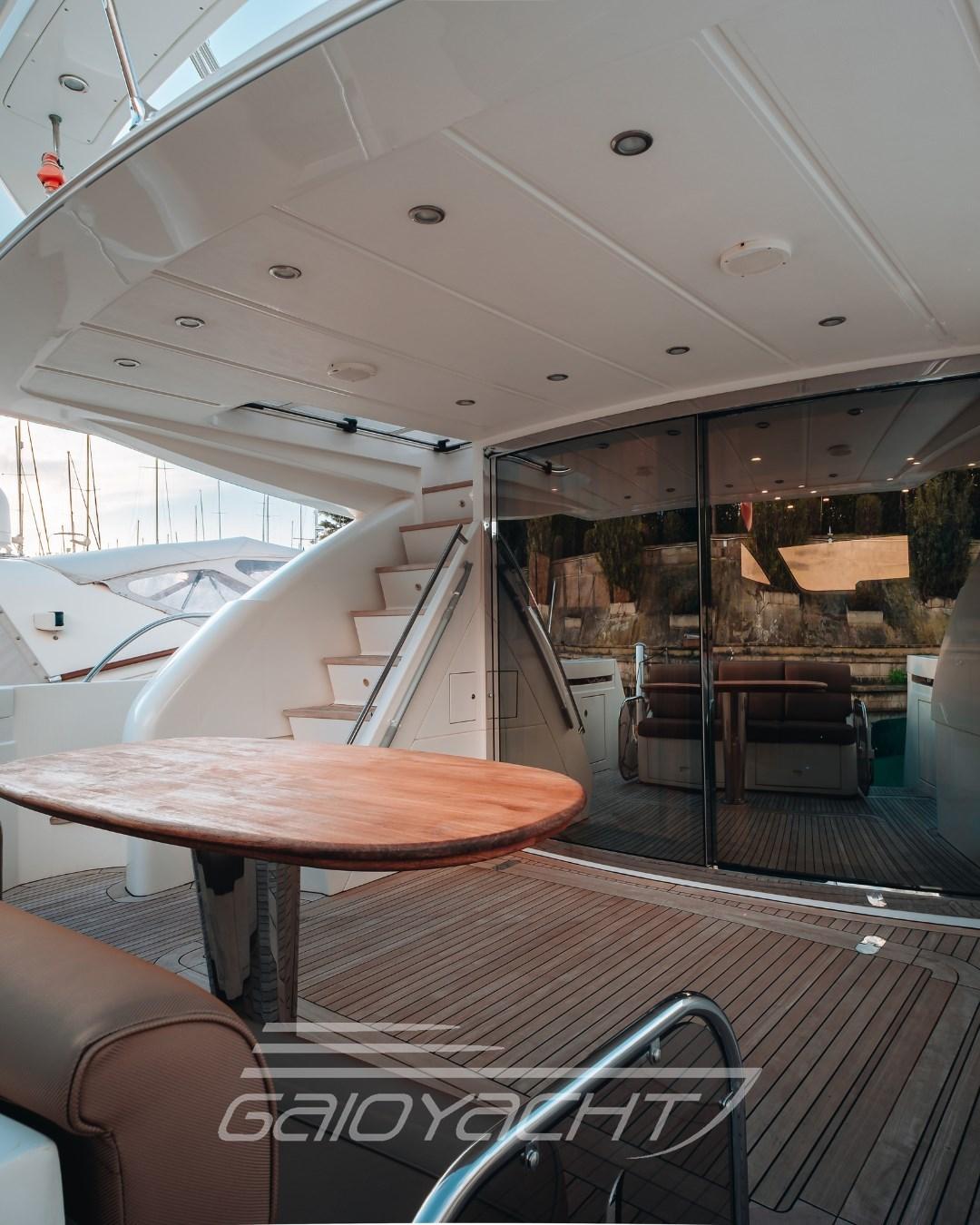 Fume/Gas Detector, Engine Alarm, Bilge Alarm, Anchor (Da sostituire), Electric Engine Compartment Opening, Auto Dynamic Trim Interceptor, Water pressure pump, Auto-Trim, Teak Side Decks, Deck Shower, Twin Steering, Directional Spotlight, Electric Flaps, Crane, Tender Crane, Fire Extinguishing System, Flaps Indicators, Courtesy Lights, Gangway, Platform, Waste Water Tank Drain Pump, Entry door, Side door, Teak Cockpit, Shorepower connector, Water harbor connector system, Electronic instrumentation repeater, Hydraulic Windlass, swimming ladder, Saddles for tender (Predisposizione), cockpit table, Horn, Teak Deckhouse, Stern Winches.