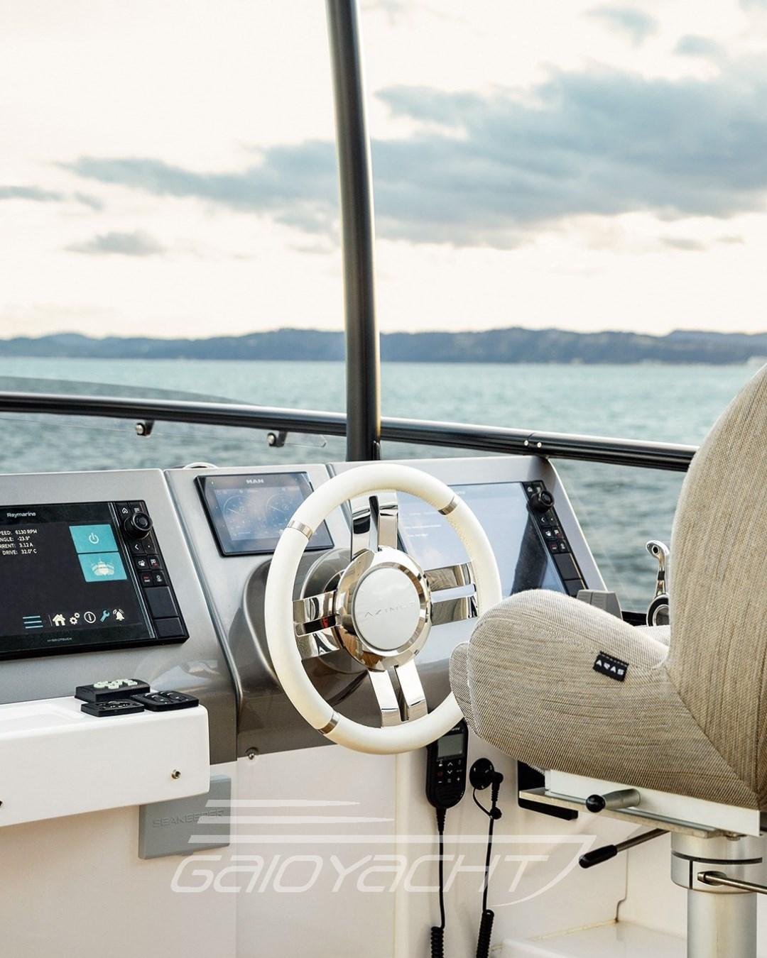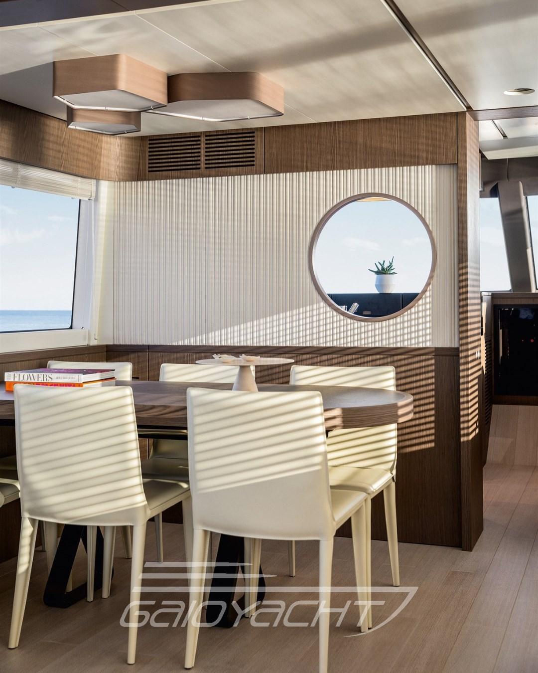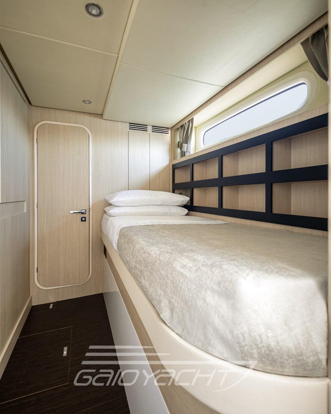 Automatic trim control; Flagpole; Manoeuvring lights; Mobile with 43'' TV; lucu Luxury package for exteriors and interiors; Bow table with electric up and down system; Teak fly floor; Privacy curtain in cockpit; Bidet in the owner's bathroom; Fourth cabin in 2-bed version; Chairs for dining table; Venetian blinds in the living room; Wooden saloon floor; Remarine goald.