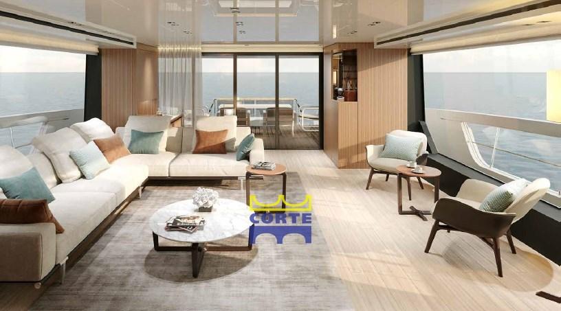 Cushions, Stern Cushions, Bow Cushions, Fly Bridge Cuscions, Cockpit Cushions, Blackout Curtains, Sunshade (parasole sul fly dietro l'hard top).