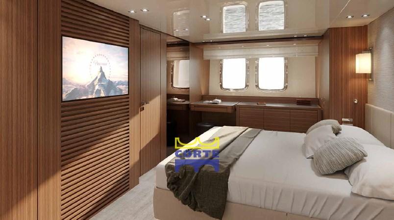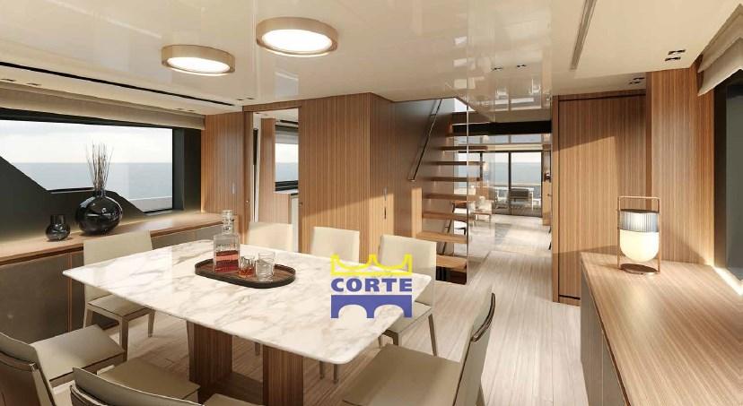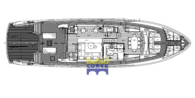 Fume/Gas Detector, Engine Alarm, Bilge Alarm, Deck Shower (flybridge), Hard top, Fire Extinguishing System, Anchor Chain Washdown, Underwater lights (n.°4 a led 7000 lumen (n° 2su spiaggetta di poppa e n°2 laterali)), Gangway, Platform, Entry door, Teak Cockpit, Shorepower connector, Water harbor connector system, swimming ladder, Stabilizers (pinne stabilizzatrici elettriche Zero Speed all'ancora e in navigazione), cockpit table.