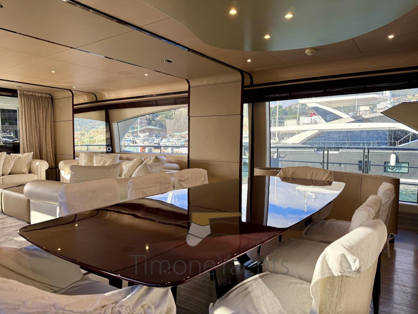 Teak Side Decks, Hydraulic Flaps, Tender Garage, Hard top, Fire Extinguishing System, Flaps Indicators, Anchor Chain Washdown, Courtesy Lights, Underwater lights, Deck Wash Pump, Teak deck, 2 Side door, Teak Cockpit, Water harbor connector system, Stabilizers, cockpit table, Tender (Williams 445 DieselJet), Stern Winches, Bow Winches.