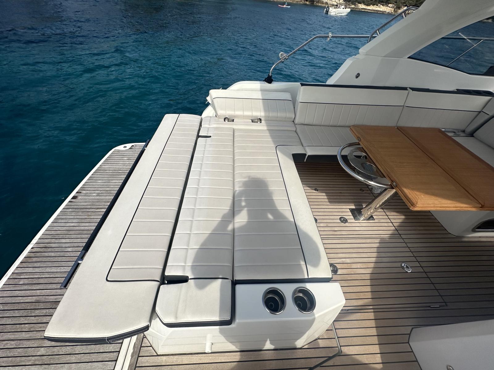 The exterior cockpit impresses with its exceptional finish quality. The teak has been fully upgraded with premium 10 mm solid teak slats across the side decks, cockpit, and swim platform. Additional custom modifications include teak integration in front of the bench seating, a redesigned folding co-pilot seat, and improvements to the anchor locker, creating a refined and high-end appearance that significantly enhances the boat’s value.