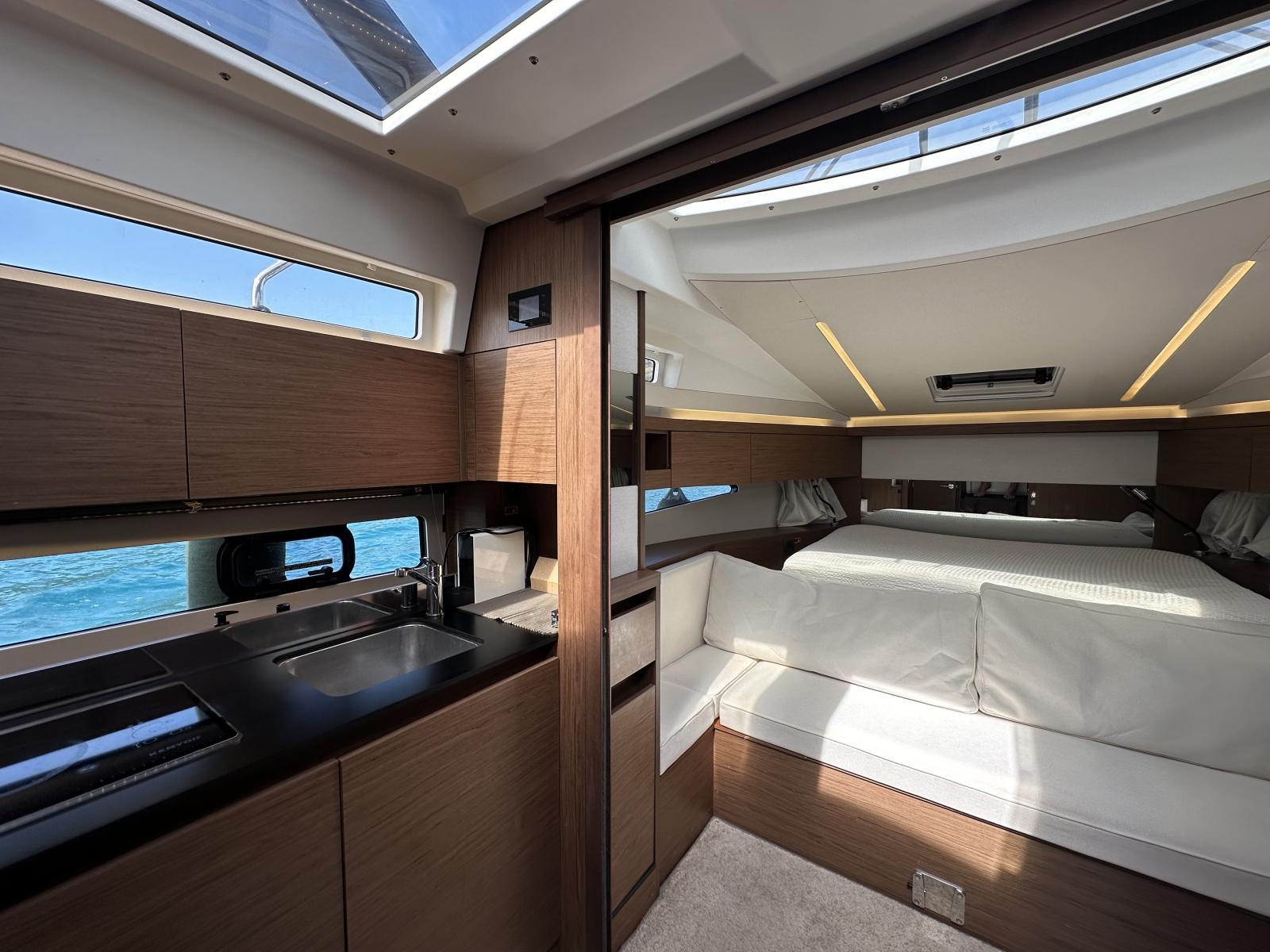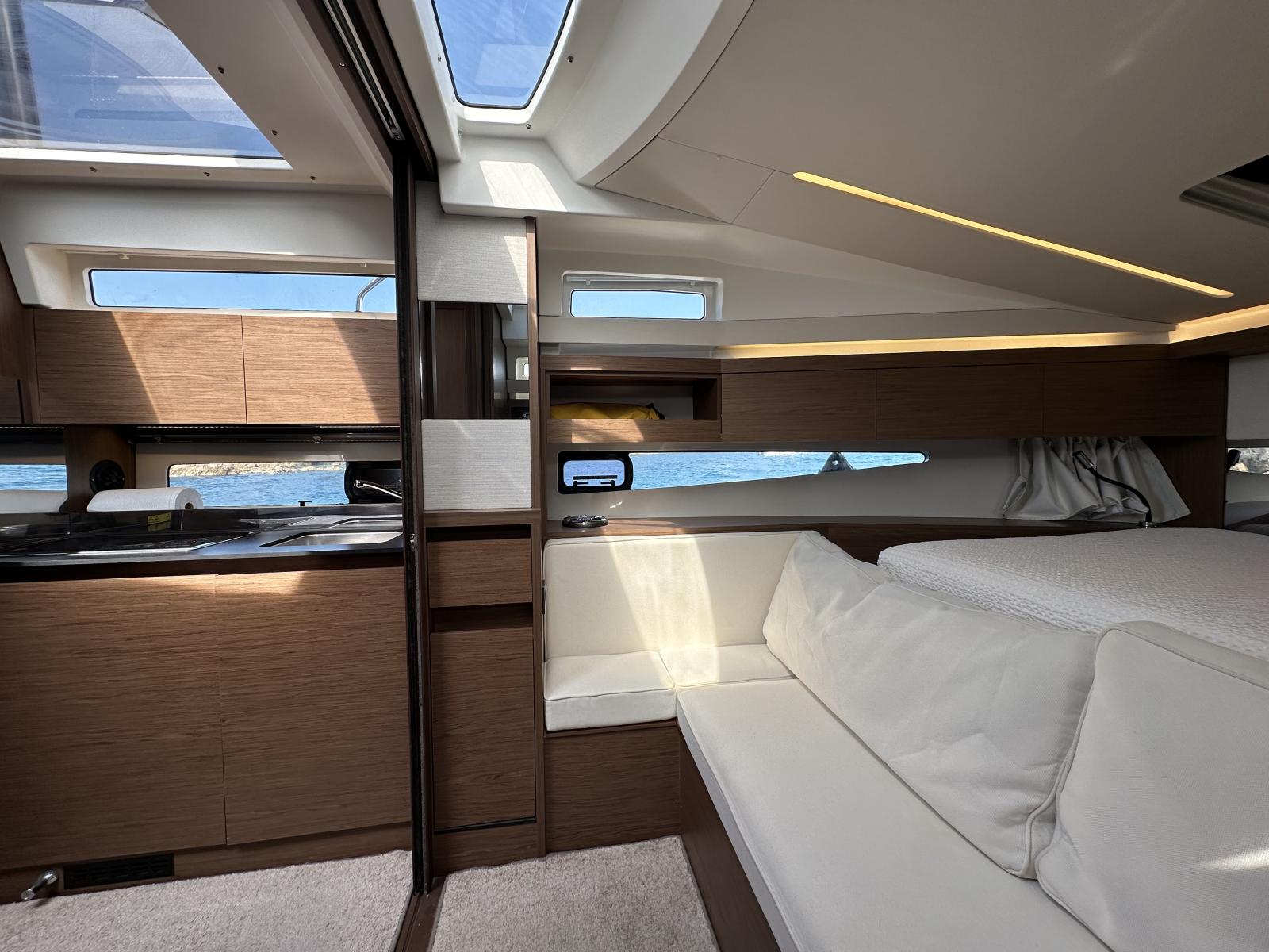 Inside, the Seavision layout combined with walnut interior woodwork and Linen Oyster White upholstery creates a bright, elegant, and welcoming atmosphere. The saloon benefits from excellent natural light thanks to its skylight, while the forward owner’s cabin offers privacy with a sliding door. The overall finish reflects Jeanneau’s highest standards.