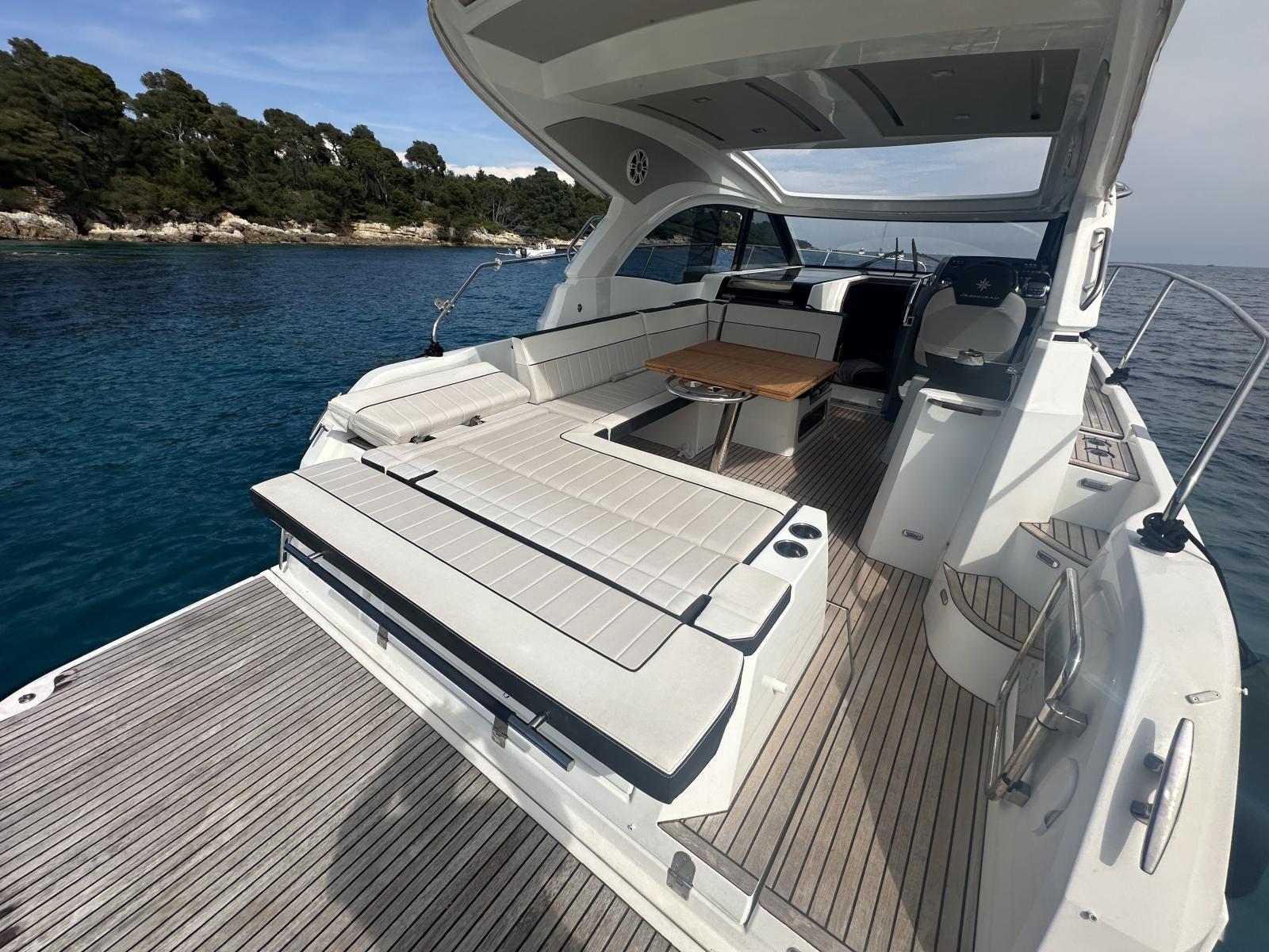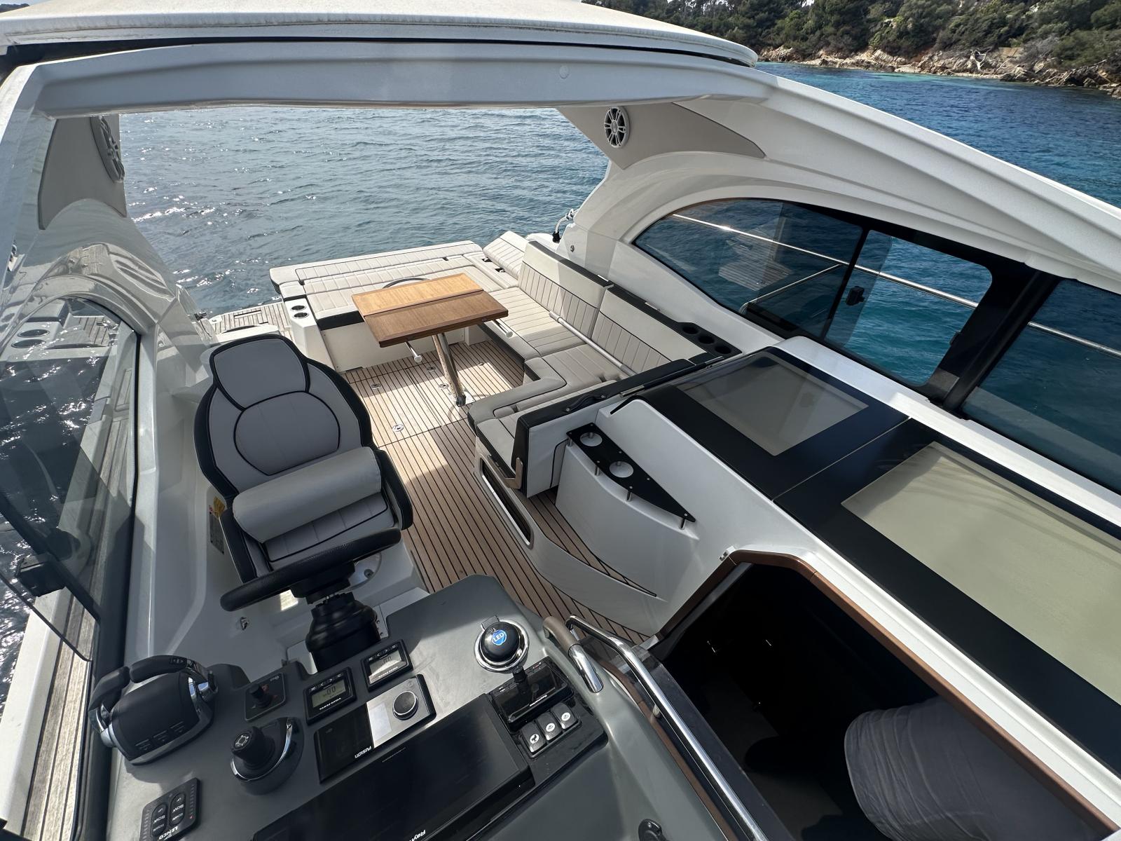 Cockpit teck premium avec nombreuses améliorations sur mesure, table cockpit teck extensible, grande chaise longue avant, banquette copilote basculante, projecteur cockpit, taud complet, bâches d’ombrage sur mesure, mât de ski inox, excellente circulation et très belle habitabilité extérieure.