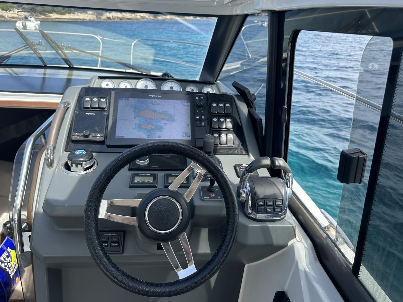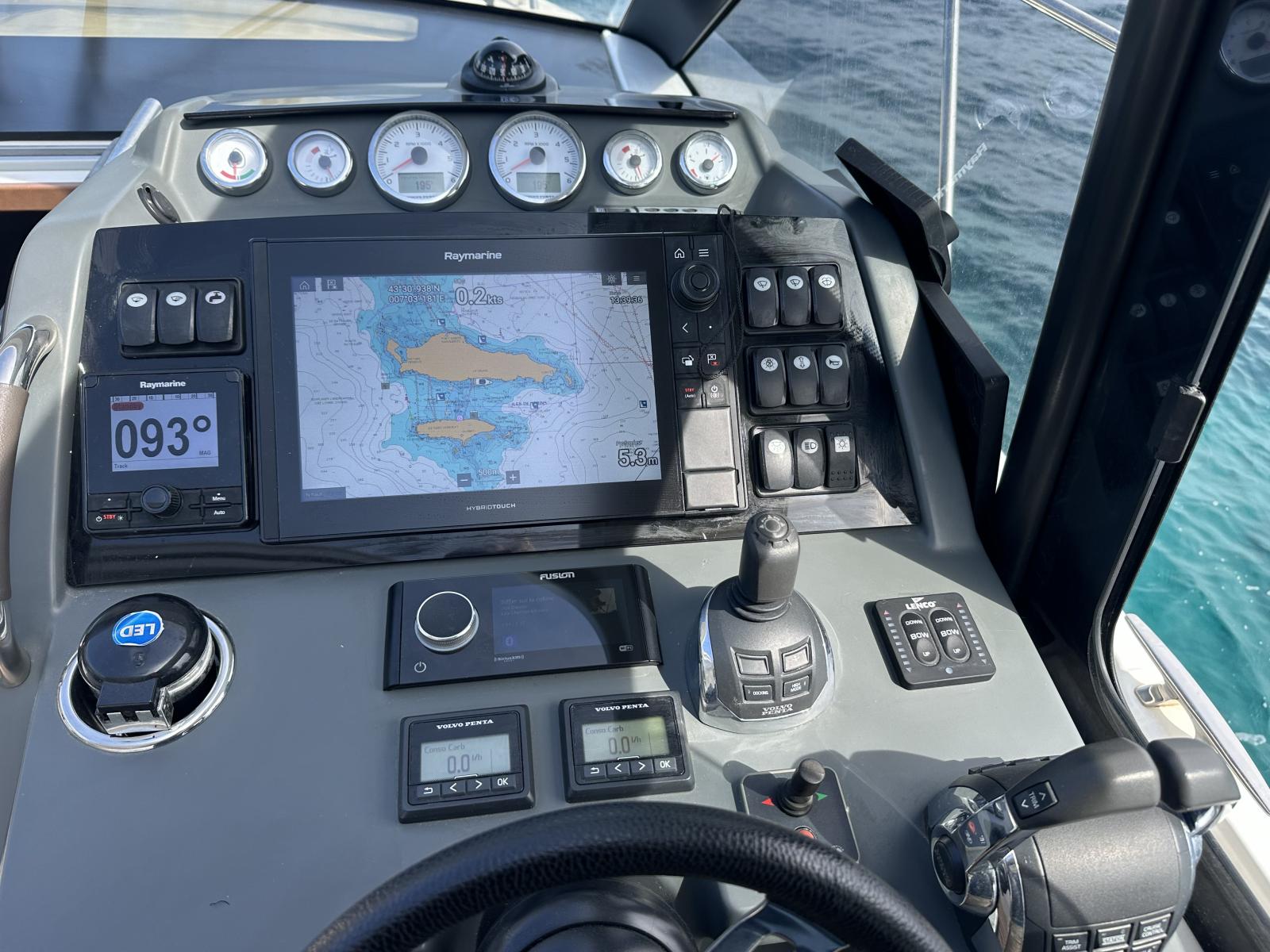 The navigation electronics have been significantly upgraded, featuring a Raymarine Axiom 12 PRO RVX chartplotter with full cartography, twin RV-212 1 kW through-hull transducers, Volvo engine interface, radar, MZ wireless chain counter, and a Raymarine EV-200 Hydraulic autopilot. This advanced setup offers a level of navigation equipment rarely found on this model.