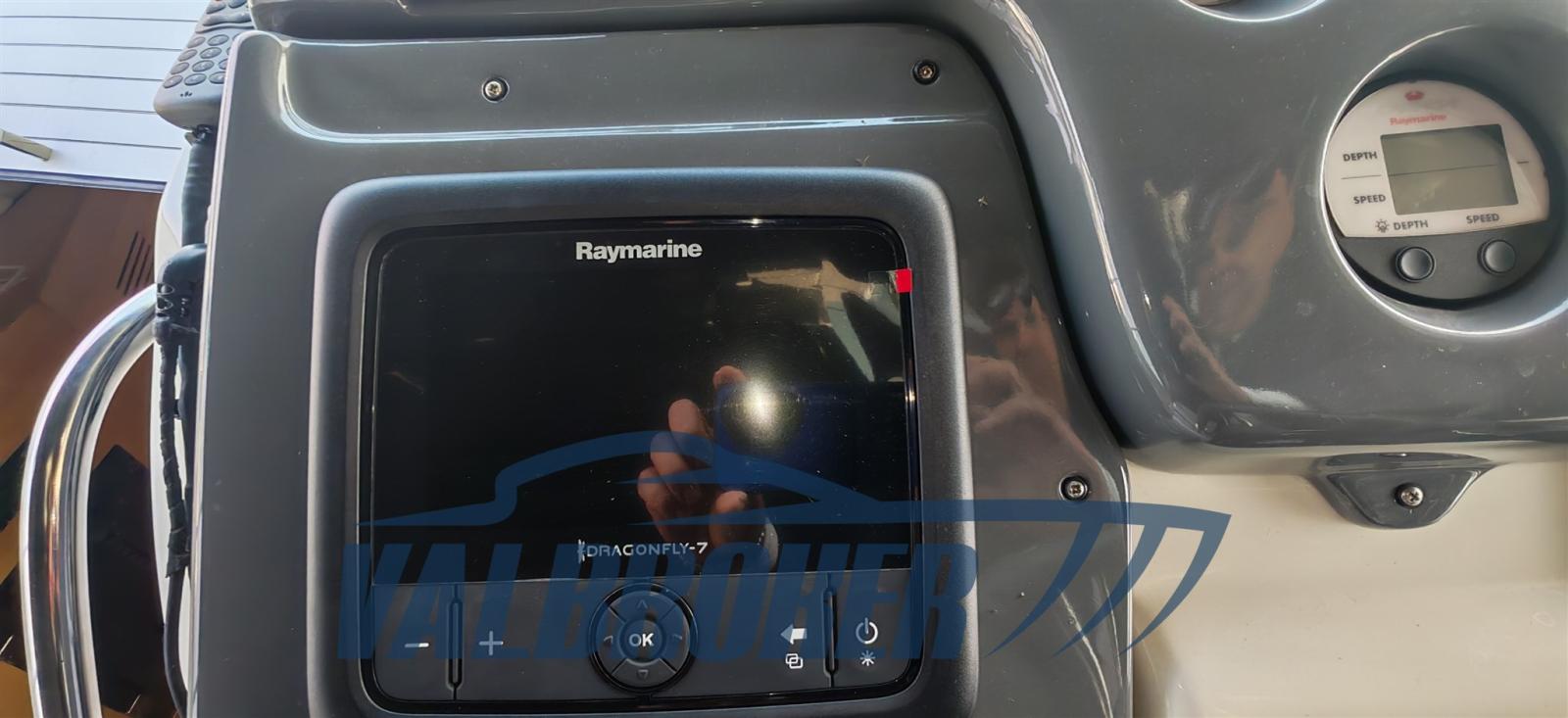 Rudder angle indicator, Compass (Ritchie), Electronic engine control, Depth Sounder (Raymarine), GPS (Dragonfly 7), VHF Radio (Raymarine 240), Co-pilot seat.