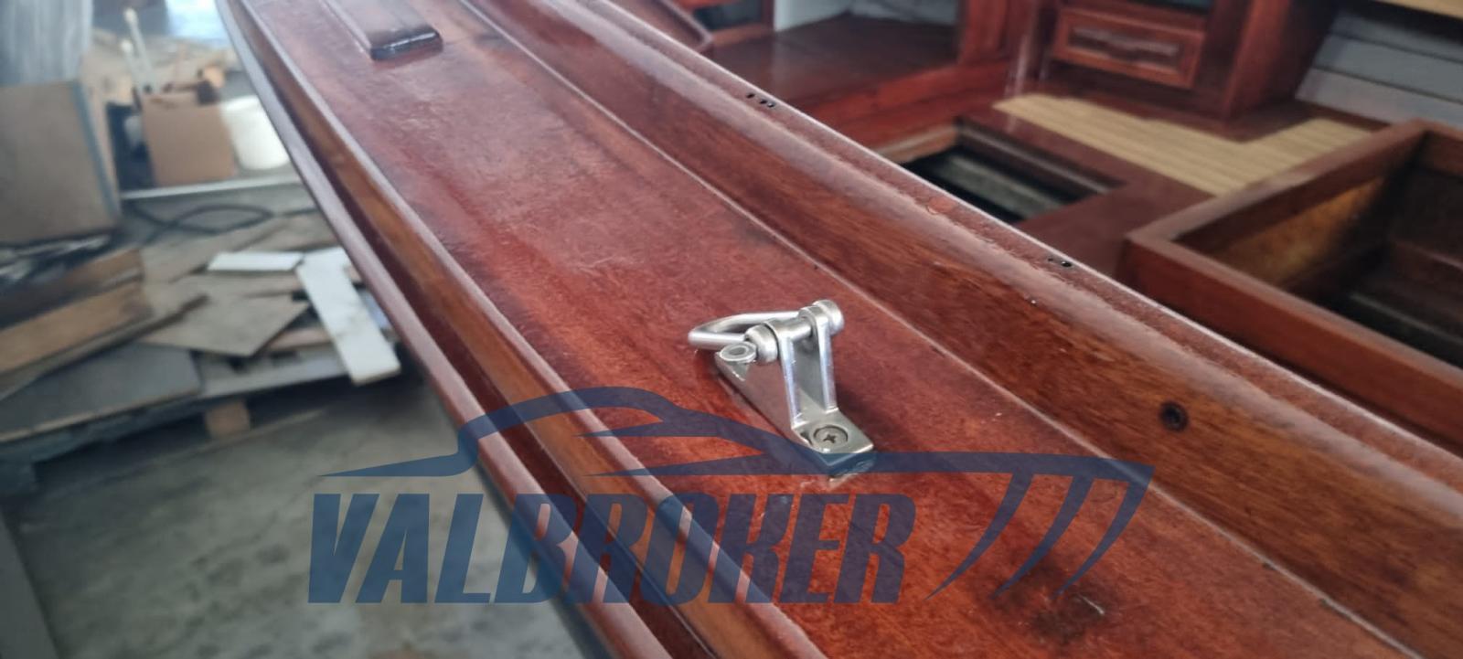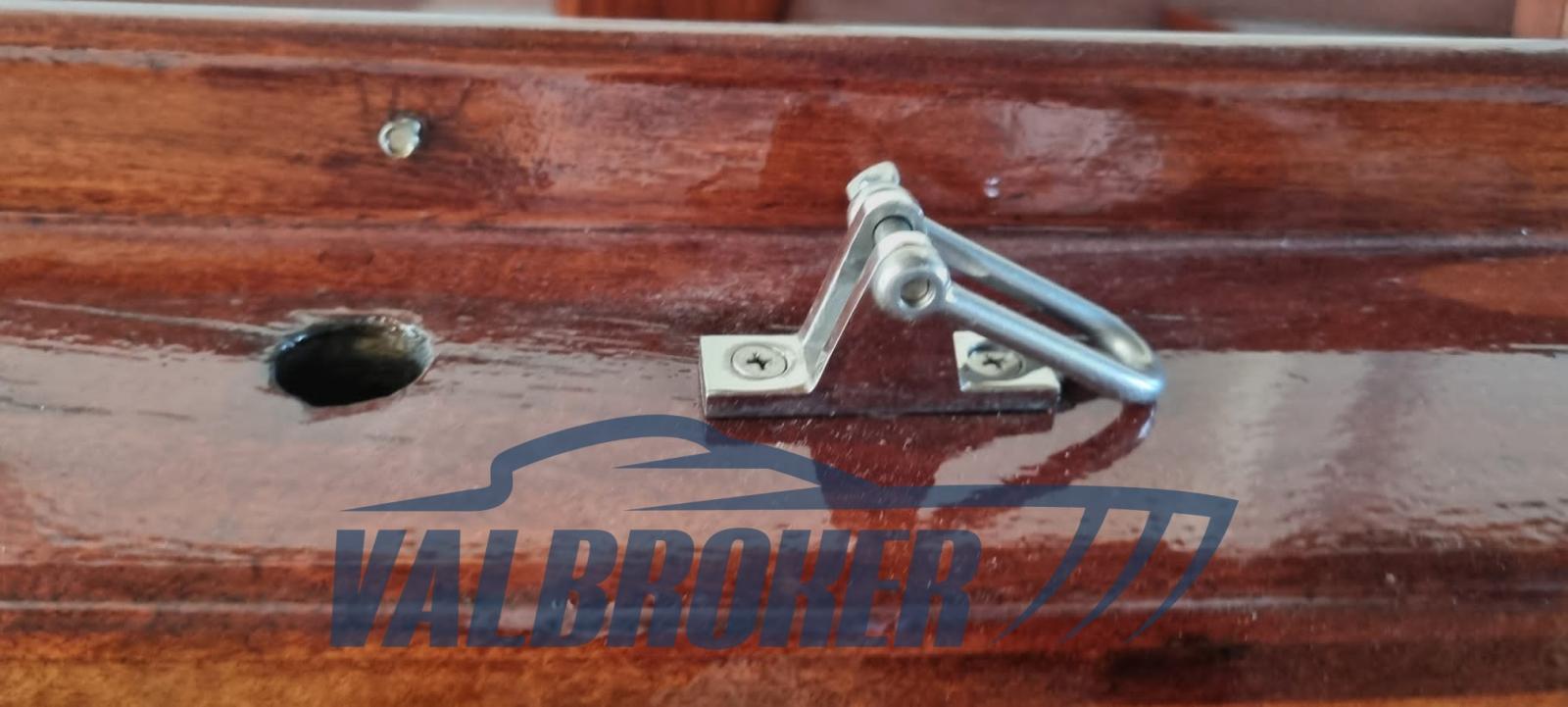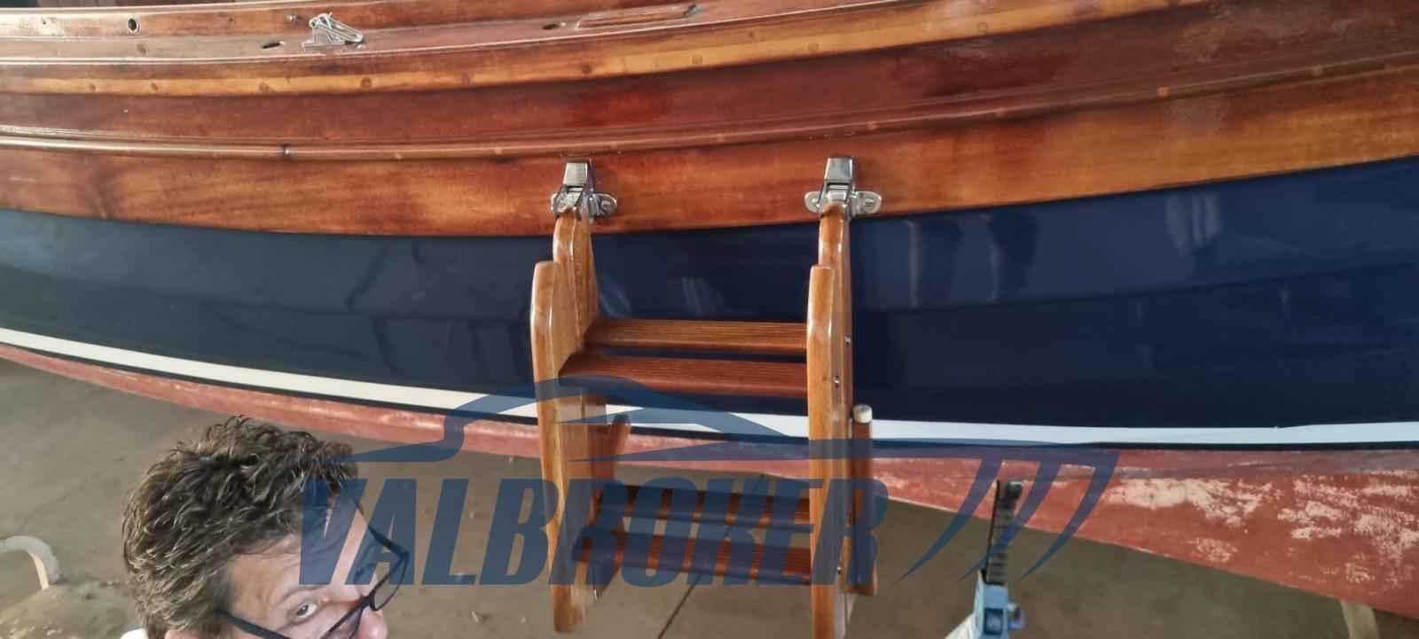 Mahogany gunwale and bow wheel,Mahogany upholstered vertical gunwale inward,Teak foredeck and aft deck,Mahogany engine locker and benches,Mahogany and teak dunnage Vertical upholstery under mahogany benches with smooth panel and opening doors,Bow flag and lion support on the helm,Mahogany transom cladding, Second diesel filter,Emergency steps applied on the rudder, Mahogany sole barrel, Mahogany vertical band, Perimeter fender with rope, Under rope made of mahogany, Additional engine soundproofing,Stern flag rod and support,Hydraulic steering with wheel diameter 60 cm,Brass hardware,CV joint applied on the shaft, Watertight compartment on the bottom of the boat, Cushions, seats and backrests for benches,Brass casing for instrument insertion,Brass upholstery hydraulic steering hub,Brass throttle lever,Night lighting under bench consisting of n°6 spotlights,Second battery for services, Heavy waterproof winter tarpaulin with support,Waterproof tarpaulin for mid-seasons, Steel socket