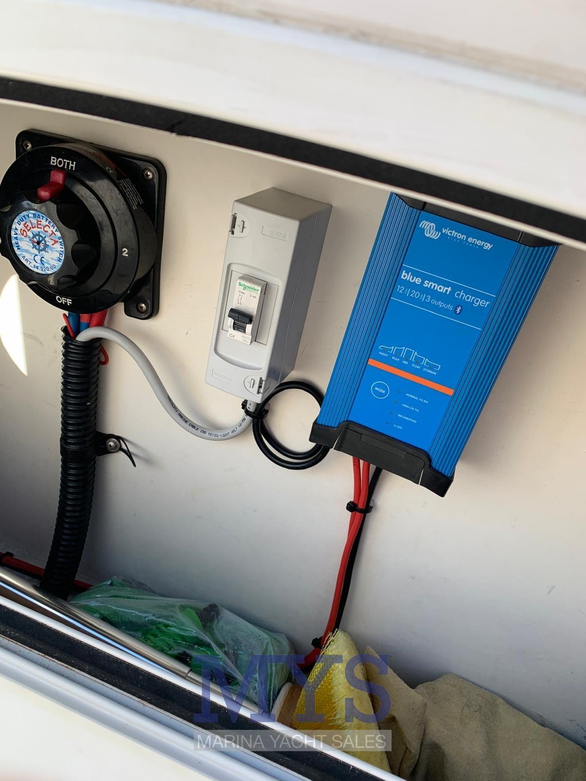 Engine Alarm, Bilge Alarm, Alternator, Anchor (con catena), Water pressure pump, 2 Batteries, Deck Shower, Anchor mount, Platform, Automatic Bilge Pump, Manual Bilge Pump, Entry door, Shorepower connector, Electric Windlass, swimming ladder, cockpit table.