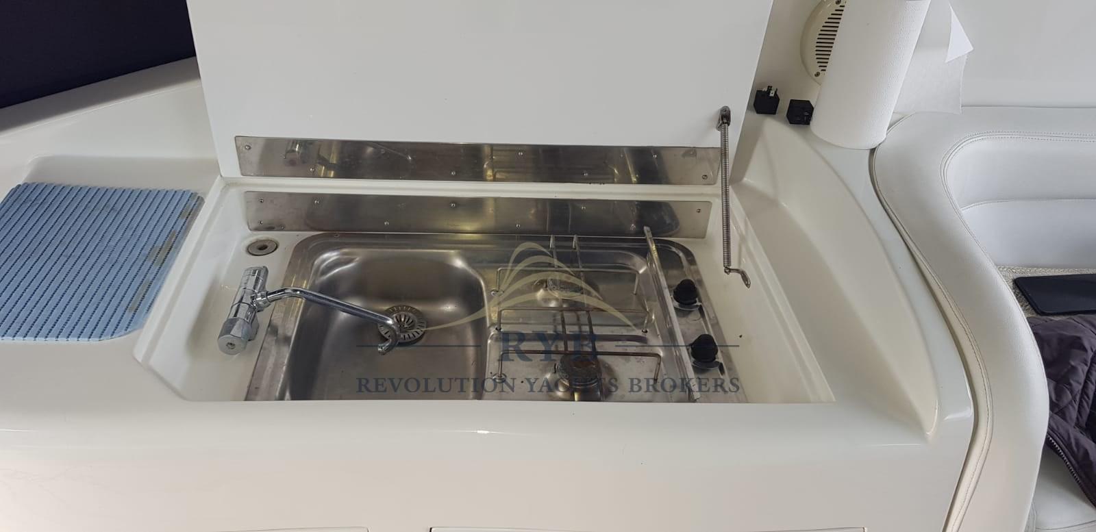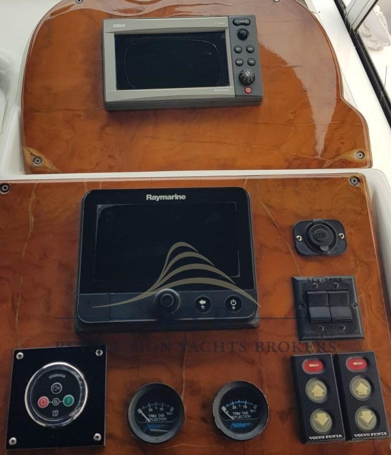 Batteries (4 BATTERIE NUOVE), Deck Shower, Hydraulic Flaps (N°2), Washbasin in the cockpit, Courtesy Lights, Gangway (IDRAULICA), Platform, Manual Bilge Pump, Teak Cockpit, Shorepower connector, Water harbor connector system, Rollbar, Electric Windlass, swimming ladder, Saddles for tender, cockpit table.