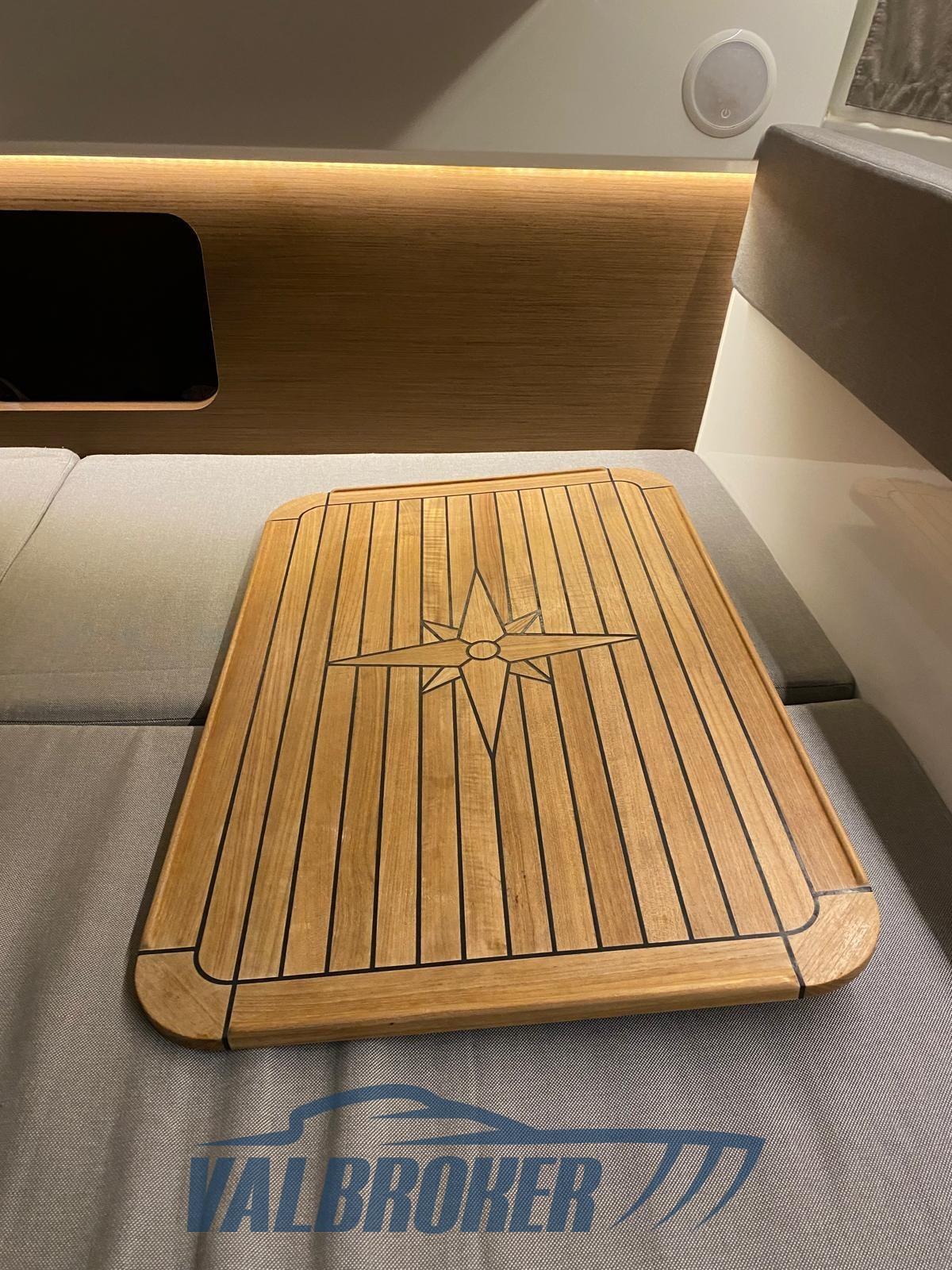 Water pressure pump, 3 Batteries, Teak Side Decks, Deck Shower, Directional Spotlight (manuale), Fire Extinguishing System, Flaps Indicators (Lenco), Courtesy Lights, Gangway (manuale pieghevole in teak), Automatic Bilge Pump, Teak Cockpit, Electric Windlass, swimming ladder, cockpit table (teak), Tender (con motore fuoribordo).