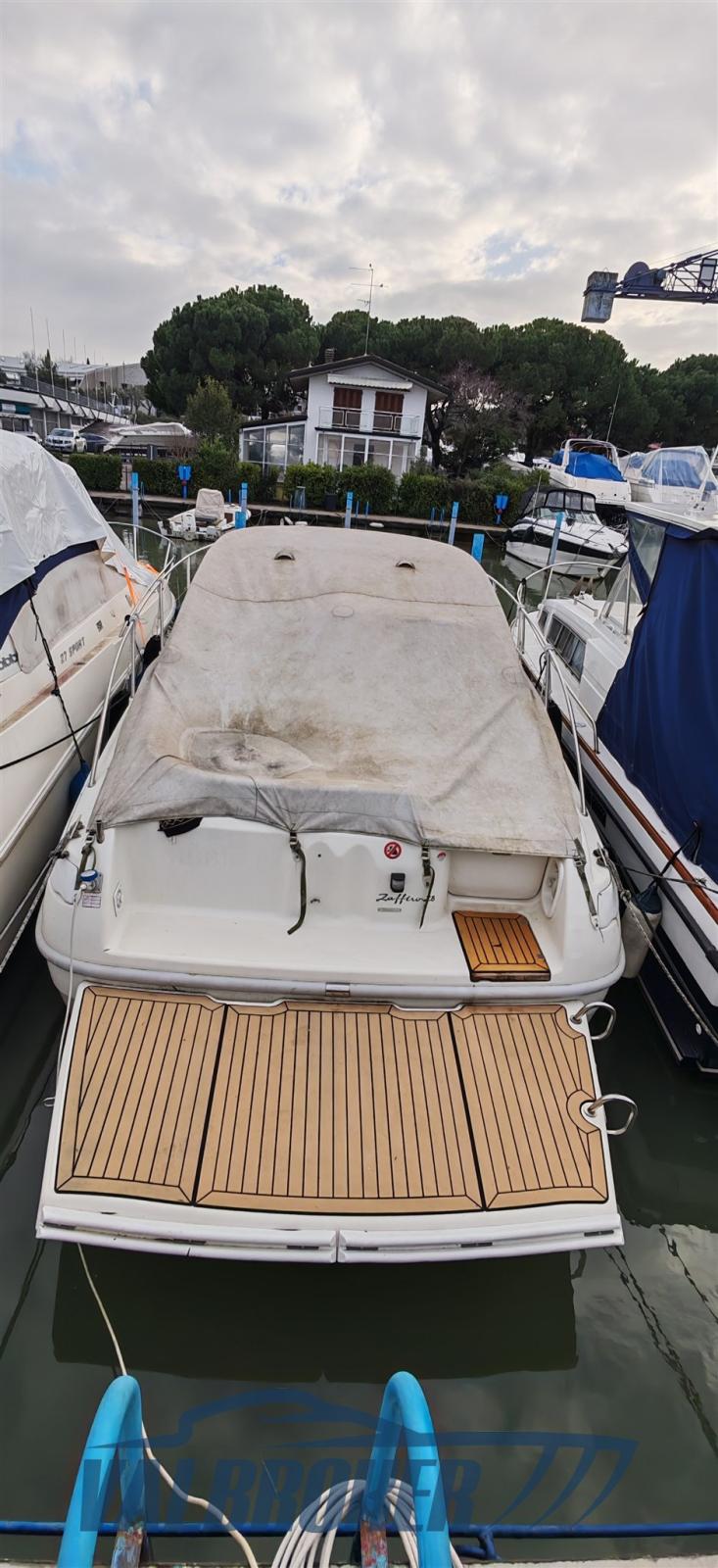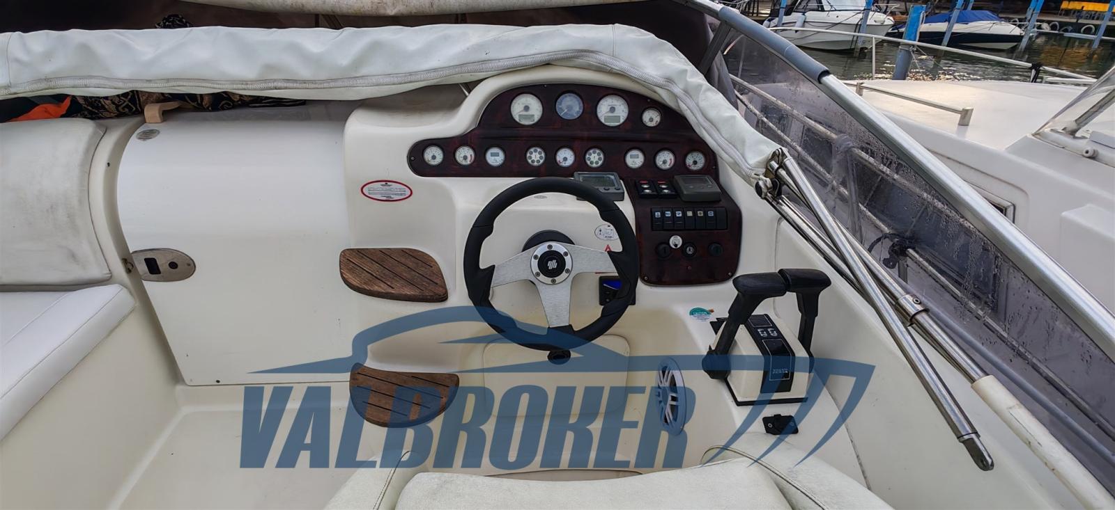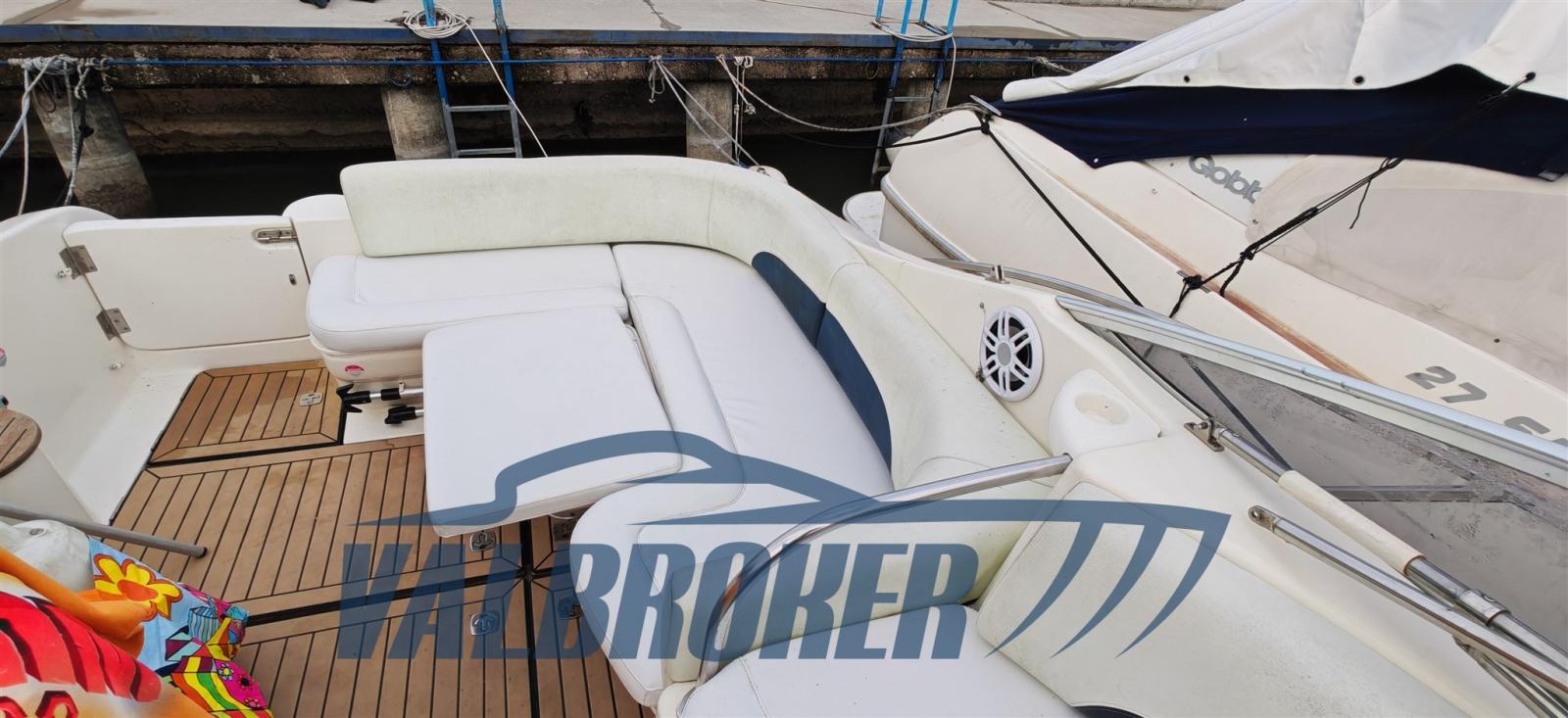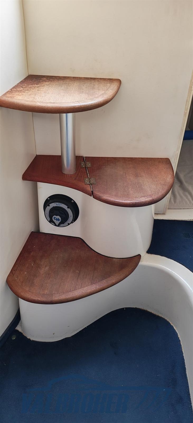 Sporty motorboat from the Italian shipyard. It is equipped with Volvo Penta 4.3 gxi V6 sterndrive engines with 225HP petrol injection. Large teak aft platform that facilitates access to the water, a spacious aft sunbathing area and a central cockpit with U-shaped seating that can be converted into a sundeck. Below deck, the cabin is accessible via two steps and offers a dinette that converts into a double bed. There is a second double berth aft, under the cockpit, and a separate bathroom. Used in fresh water only.