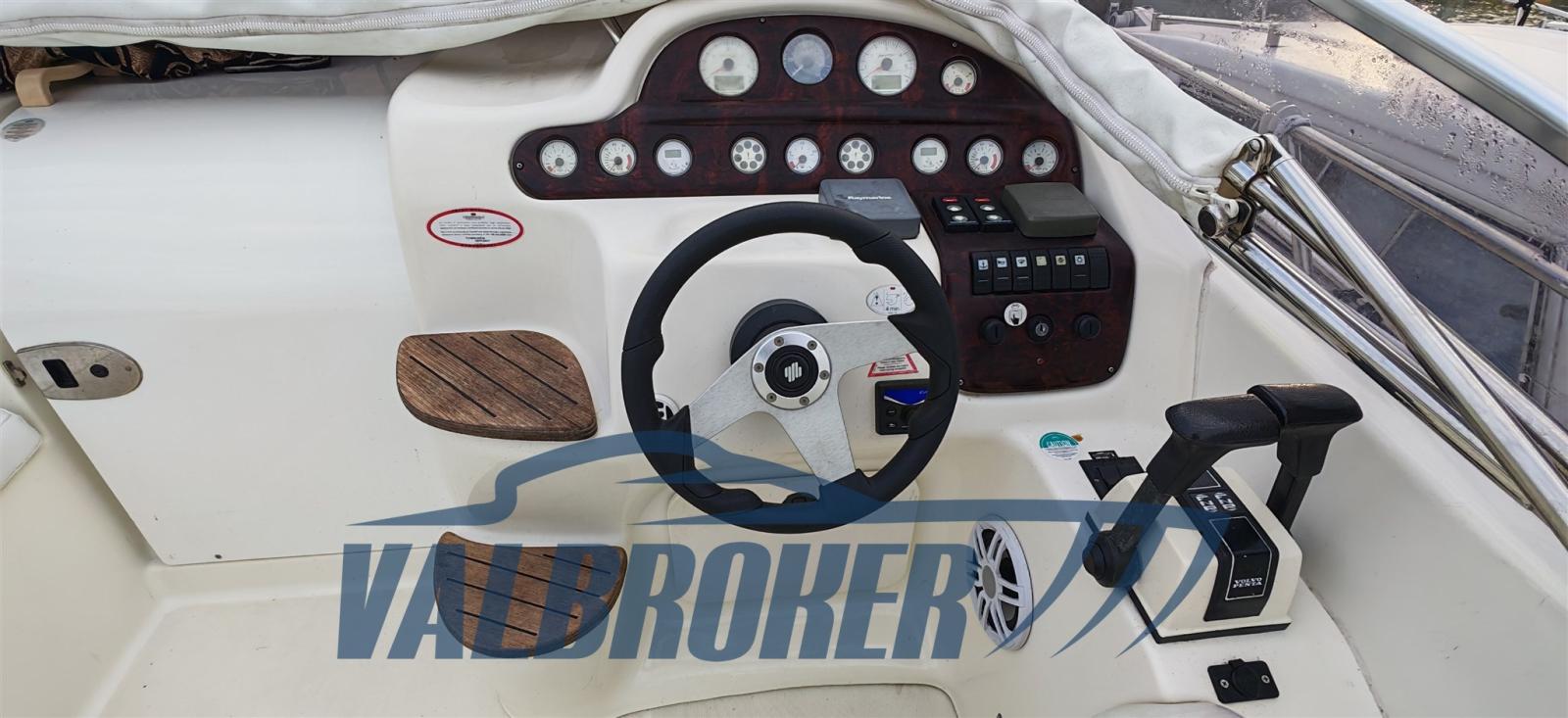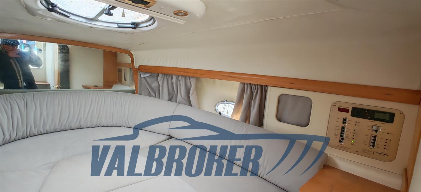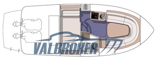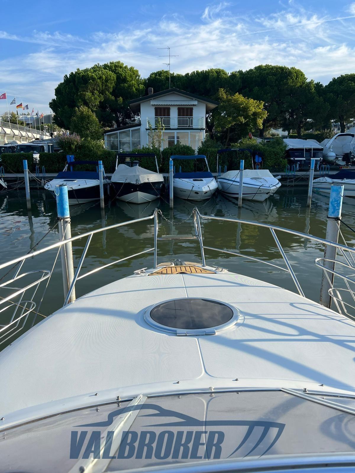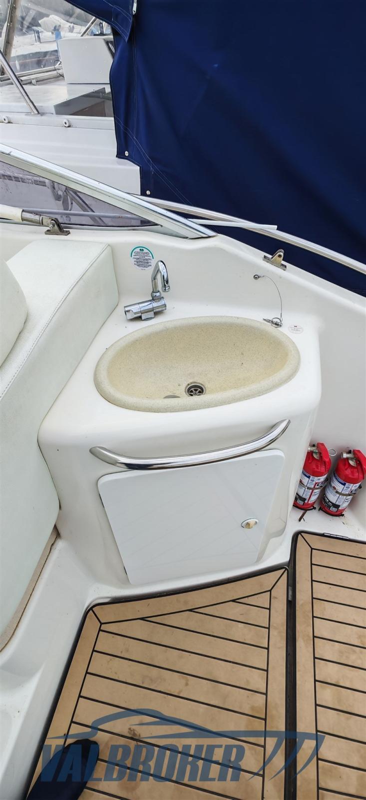 Sporty motorboat from the Italian shipyard. It is equipped with Volvo Penta 4.3 gxi V6 sterndrive engines with 225HP petrol injection. Large teak aft platform that facilitates access to the water, a spacious aft sunbathing area and a central cockpit with U-shaped seating that can be converted into a sundeck. Below deck, the cabin is accessible via two steps and offers a dinette that converts into a double bed. There is a second double berth aft, under the cockpit, and a separate bathroom. Used in fresh water only.