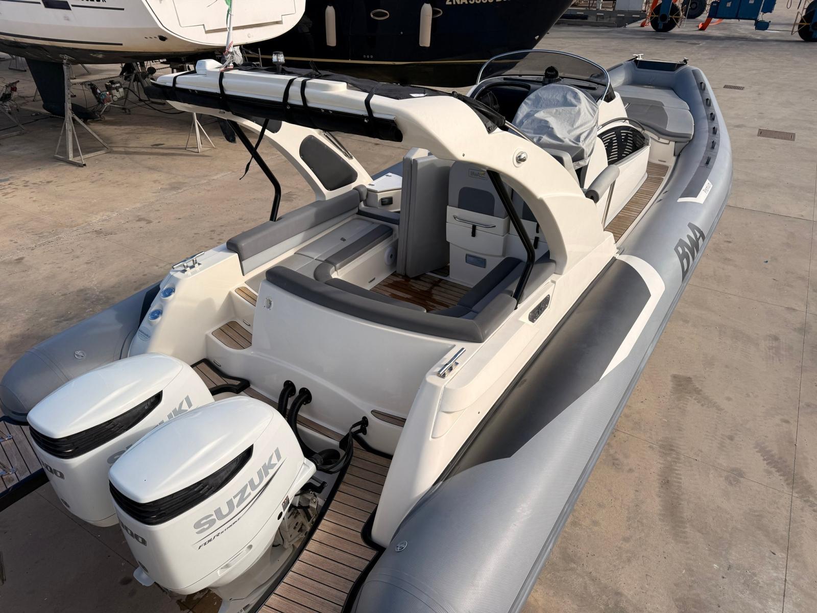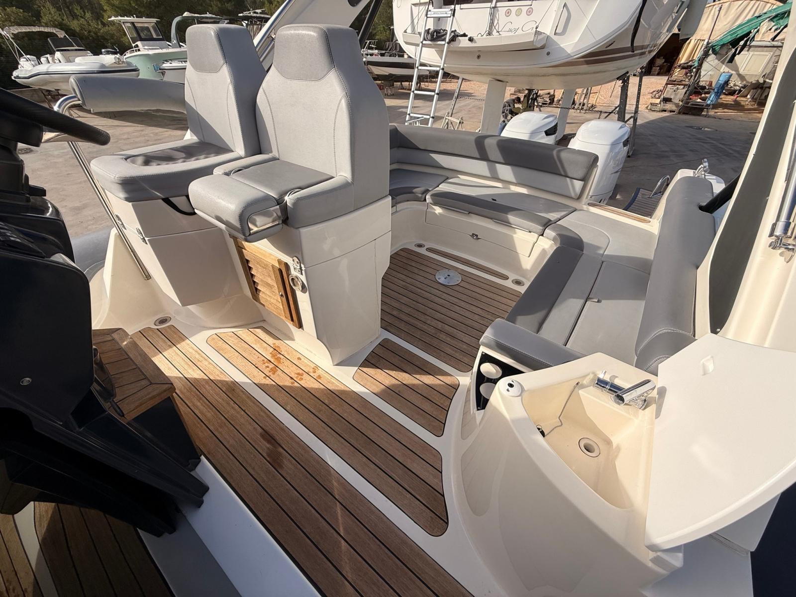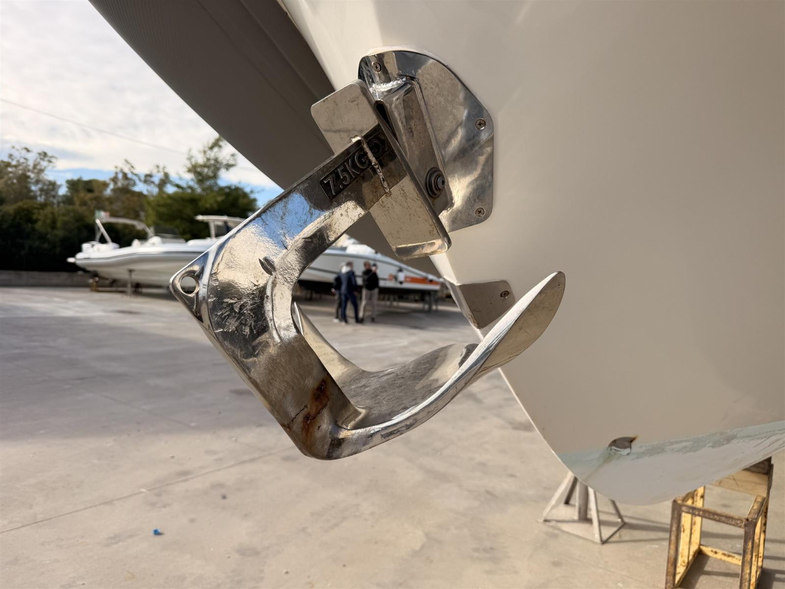 Anchor (INOX), Water pressure pump, 3 Batteries (100 AH), Teak Side Decks, Battery charger (VICTRON), Shore power cable, Deck Shower, Washbasin in the cockpit, Courtesy Lights, 4 Fenders, Platform, Manual Bilge Pump, Teak Cockpit, Shorepower connector, Electric Windlass, swimming ladder, cockpit table.