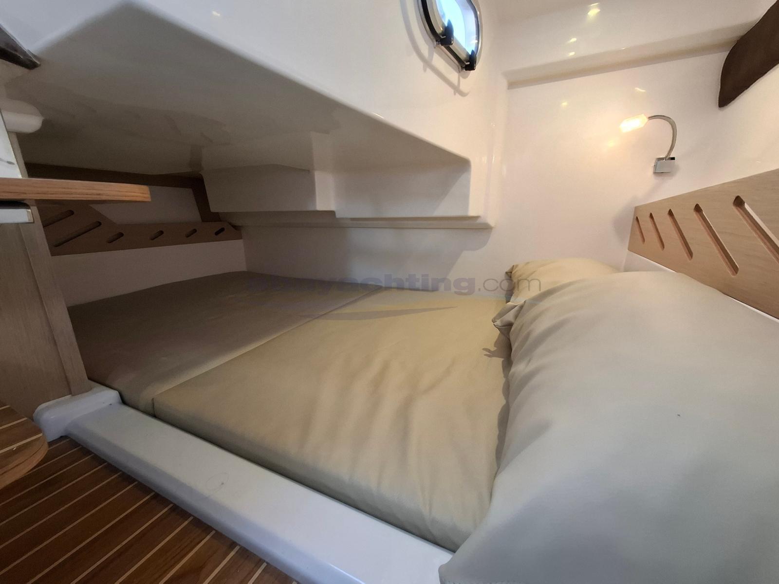 Two cabins, full bathroom with shower and electric toilet, versatile cockpit with table that converts into a sunbed, rubber-coated platform for comfort and safety.