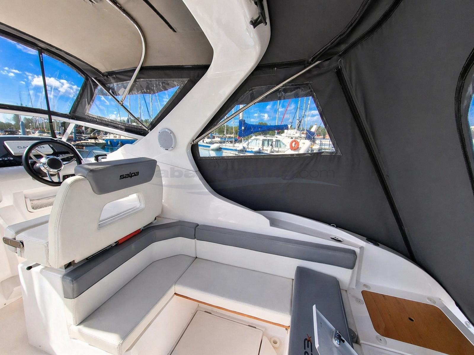 Sprayhood (pozzetto in Sunbrella colore grigio anteriore e posteriore + chiusura notte/campeggio con archi in acciaio inox), Cockpit Cover, Hull Cover (copri rollbar bianco, coprimotore grigio originale Honda Marine), Cushions, Stern Cushions, Bow Cushions, Cockpit Cushions, Mattresses, Boat cover, Sunshade (tendalino bianco con chiusura totale).