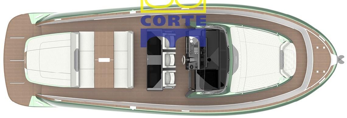 Large cockpit with sundeck, dinette with opposing sofas, including the forward one with a movable backrest to make the seats facing forward, bar cabinet, the steering console.