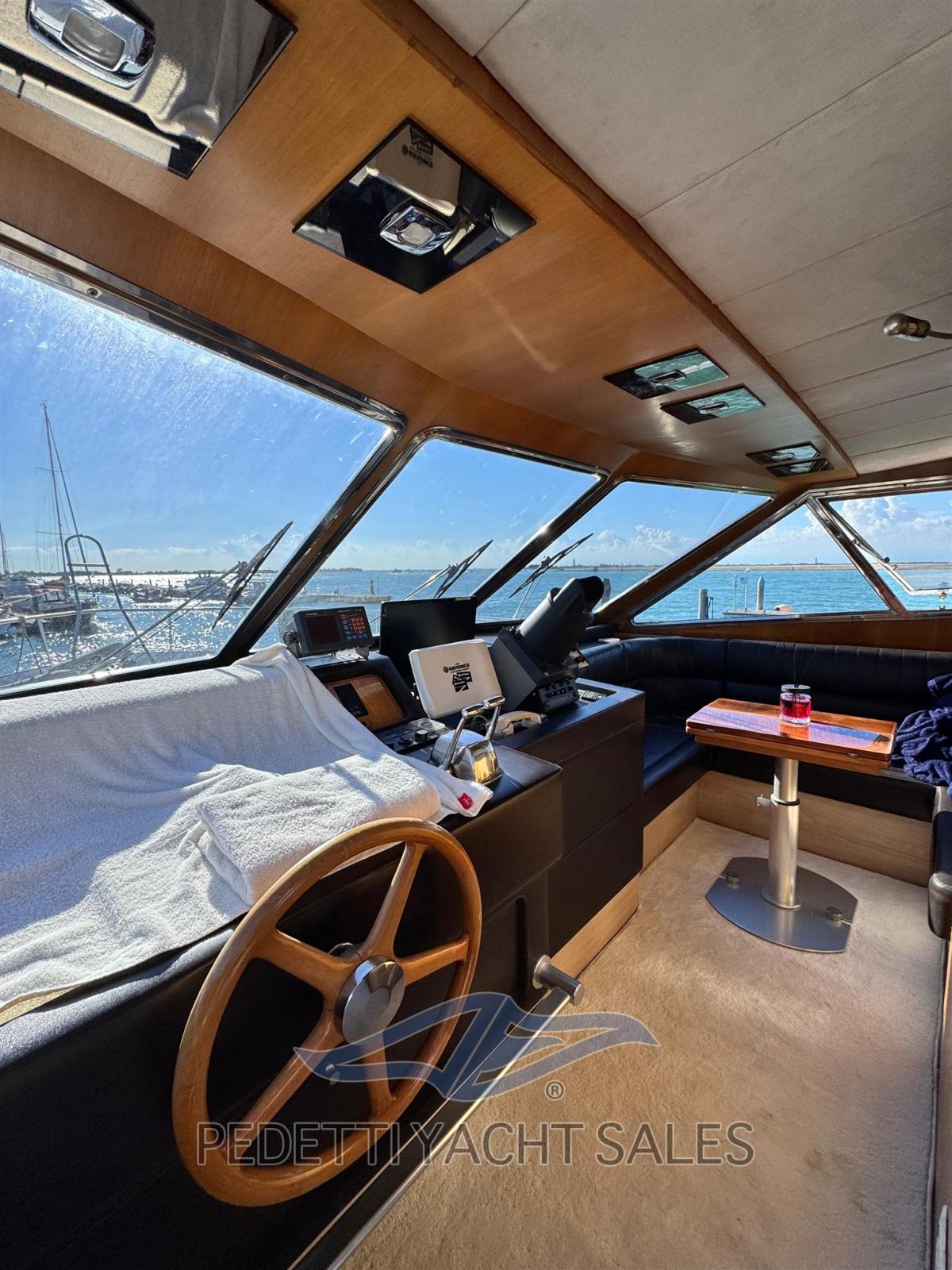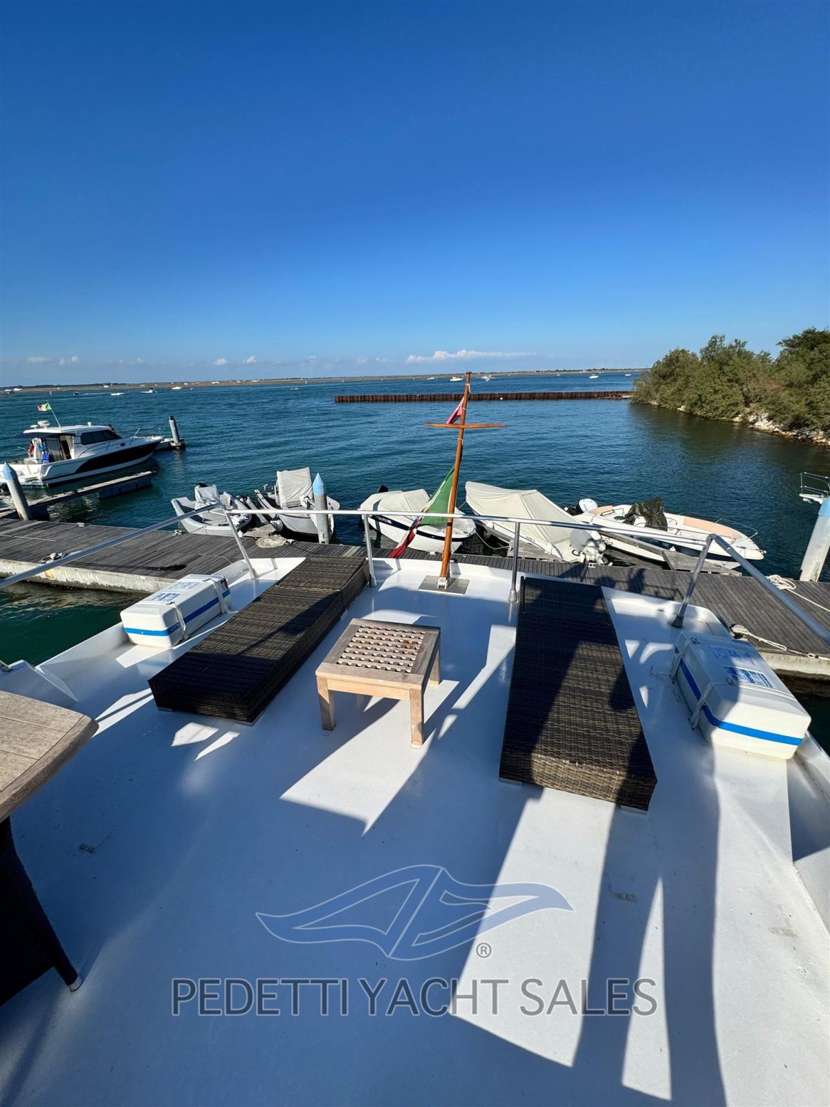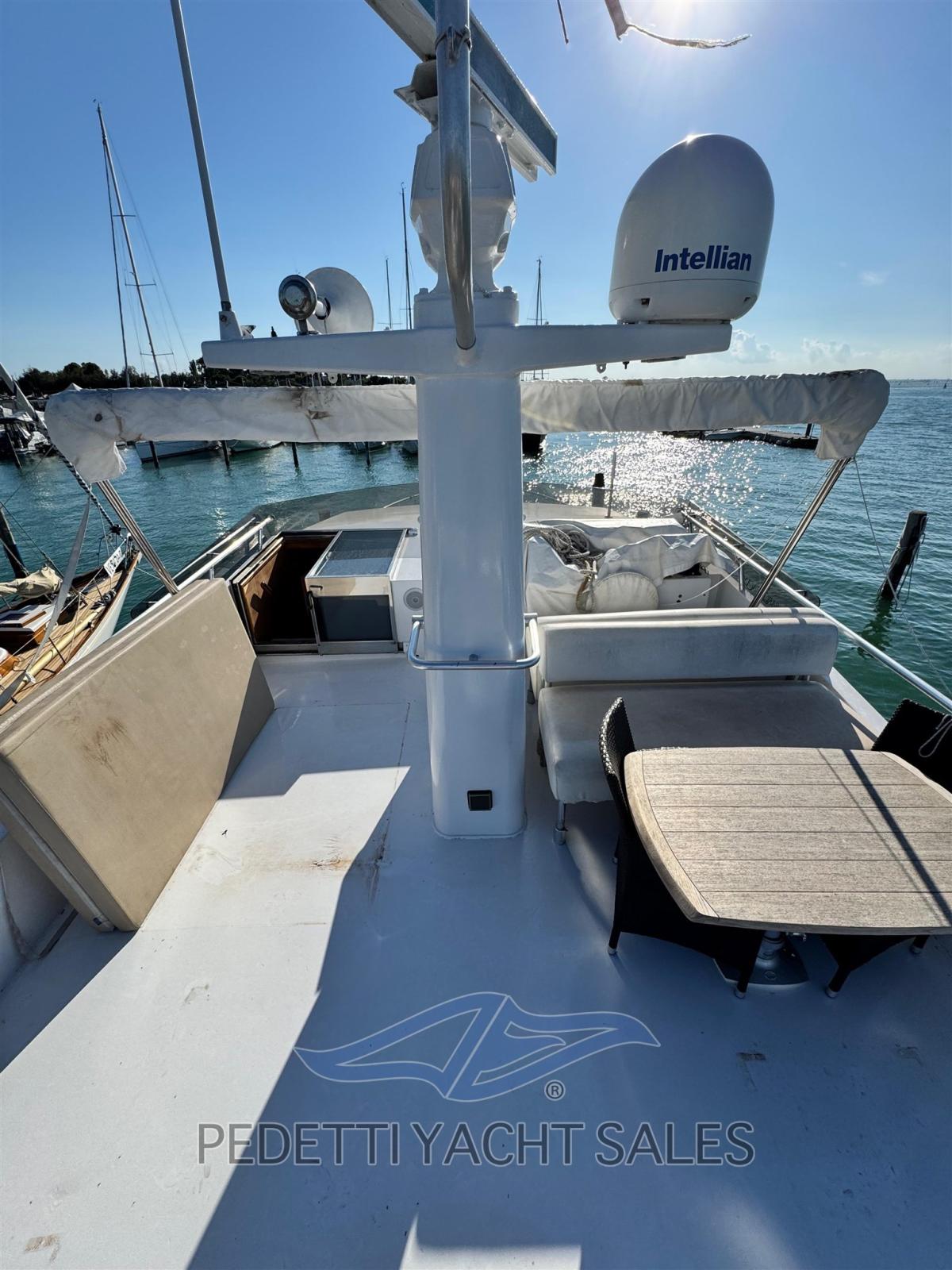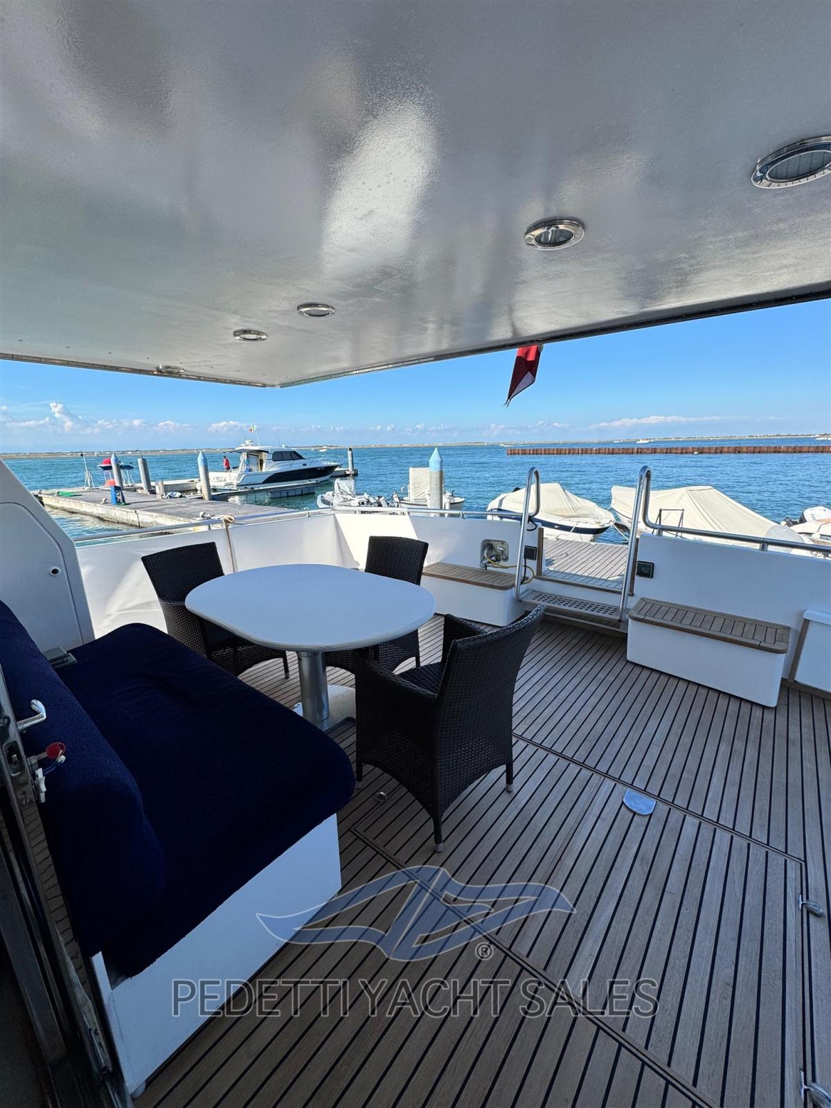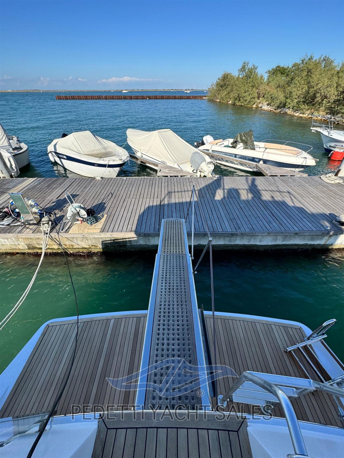 Fume/Gas Detector, Engine Alarm, Bilge Alarm, Anchor (50kg con catena acciaio zincato diam 12 120m), Water pressure pump, Draining System, Teak Side Decks, Deck Shower, Twin Steering, Stern Thruster (Preventivata non ancora installata), Anchor mount, Electric Flaps, Hydraulic Flaps (N°2), Flaps Indicators, Anchor Chain Washdown, Courtesy Lights, Underwater lights, Fenders, Gangway (Opacmare), Platform, Automatic Bilge Pump, Teak deck, Entry door, Side door, Teak Cockpit, Shorepower connector, Voltage Rectifier, Electric Windlass, Gang Board, swimming ladder, cockpit table, guard rails with gates, Horn, Teak Deckhouse, Bow Winches.