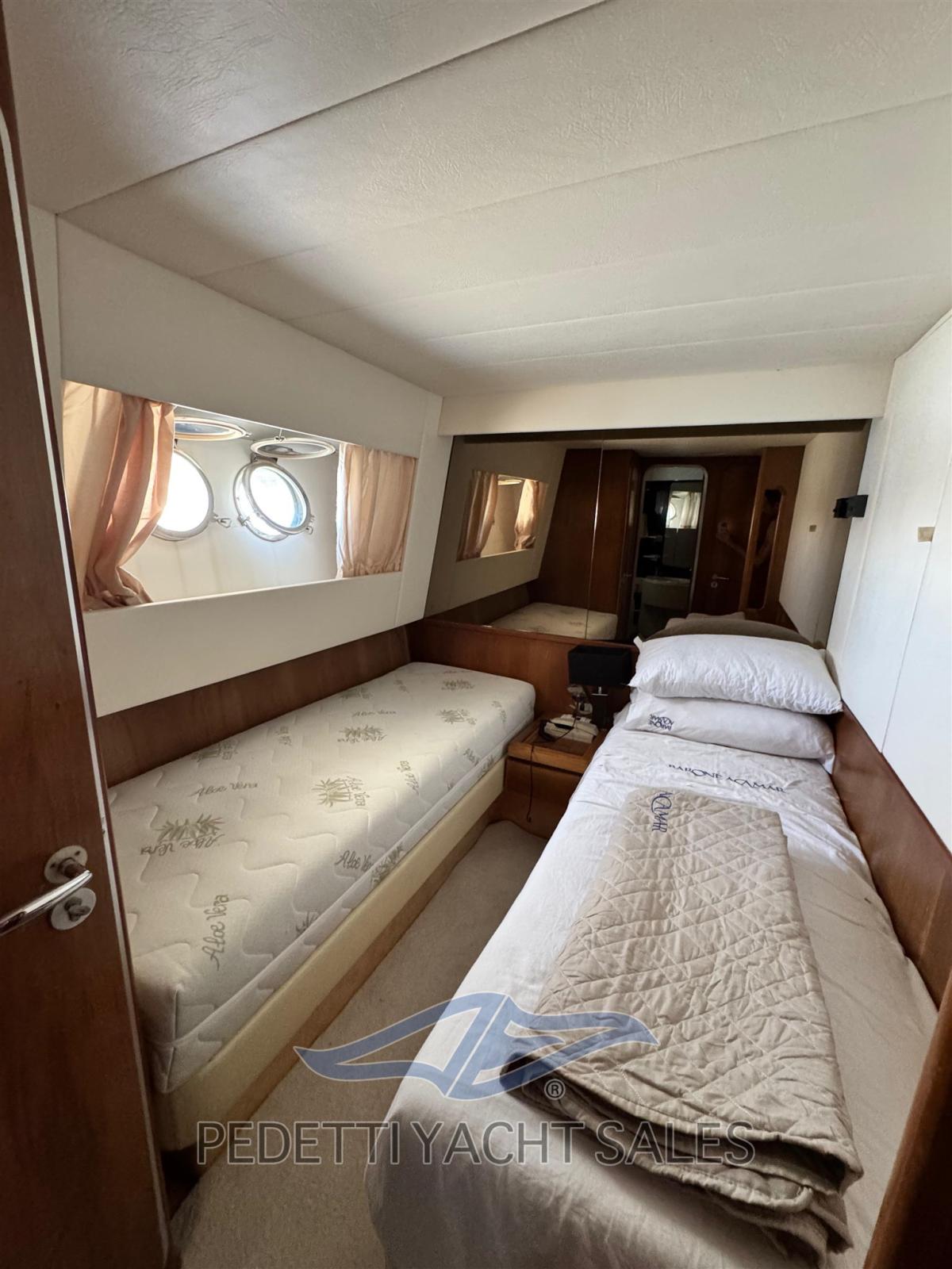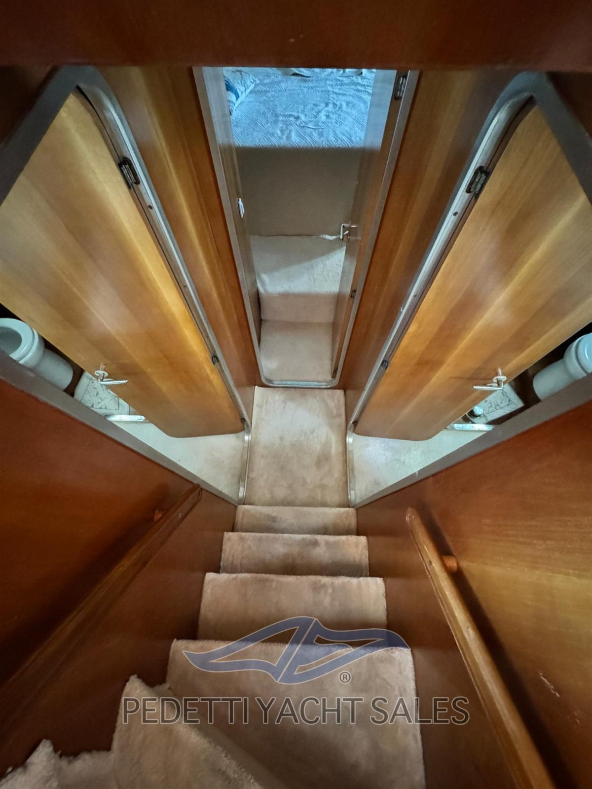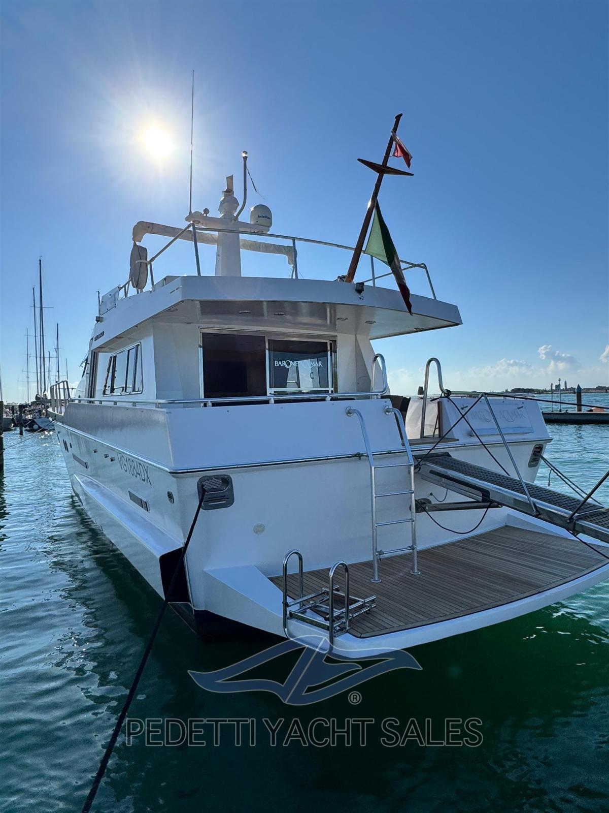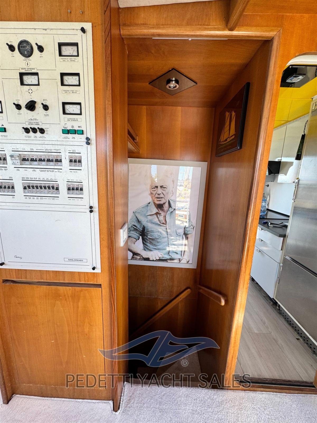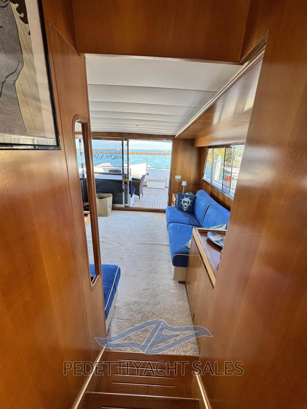 Fume/Gas Detector, Engine Alarm, Bilge Alarm, Anchor (50kg con catena acciaio zincato diam 12 120m), Water pressure pump, Draining System, Teak Side Decks, Deck Shower, Twin Steering, Stern Thruster (Preventivata non ancora installata), Anchor mount, Electric Flaps, Hydraulic Flaps (N°2), Flaps Indicators, Anchor Chain Washdown, Courtesy Lights, Underwater lights, Fenders, Gangway (Opacmare), Platform, Automatic Bilge Pump, Teak deck, Entry door, Side door, Teak Cockpit, Shorepower connector, Voltage Rectifier, Electric Windlass, Gang Board, swimming ladder, cockpit table, guard rails with gates, Horn, Teak Deckhouse, Bow Winches.