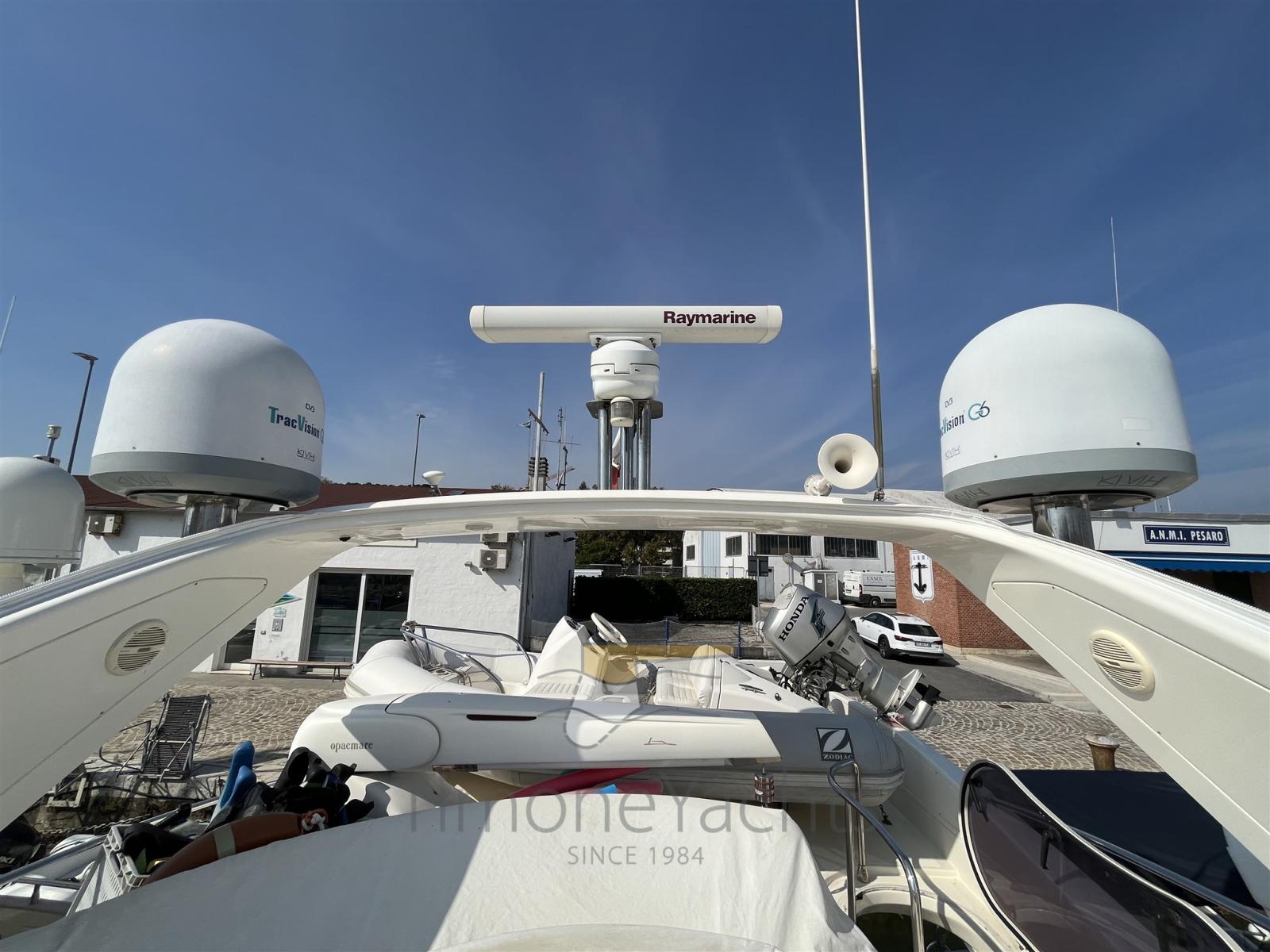 Engine Alarm, Bilge Alarm, Water pressure pump, Deck Shower, Twin Steering, Directional Spotlight, Hydraulic Flaps, Fire Extinguishing System, Flaps Indicators, Anchor Chain Washdown, Courtesy Lights, Gangway (in teak), Platform (in teak), Automatic Bilge Pump, Manual Bilge Pump, Teak Cockpit, Shorepower connector, Voltage Rectifier, Rollbar, Electric Windlass, swimming ladder, cockpit table, Tender (Con fuori bordo), guard rails with gates, Stern Winches, Bow Winches.