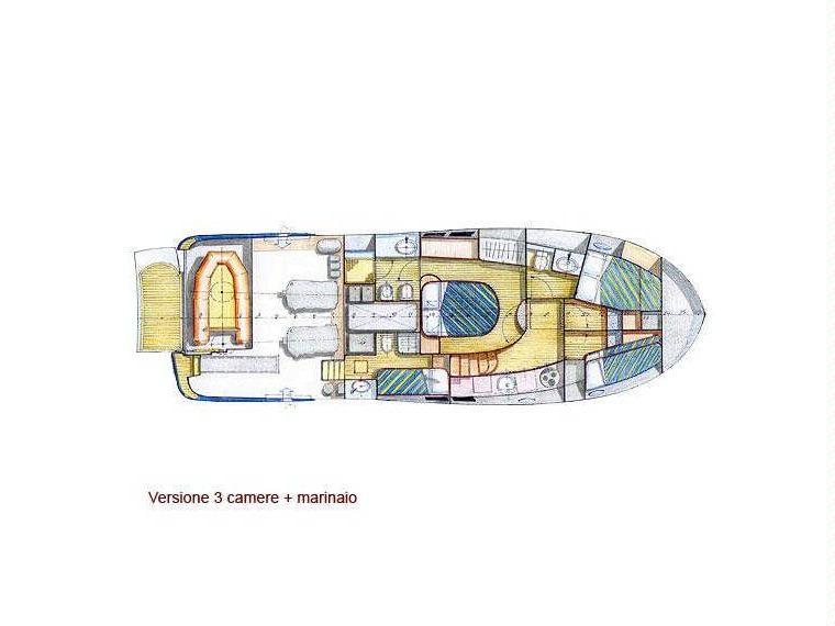 Engine Alarm, Bilge Alarm, Water pressure pump, 6 Batteries (2 servizi nuove 2024), Teak Side Decks, Special Colour (blu (verniciatura totale 2019 )), Deck Shower, Stern Thruster (installata 2019), Directional Spotlight, Electric Flaps, Tender Garage, Hard top, Flaps Indicators, Courtesy Lights, Gangway (elettro idraulica a scomparsa), Platform, Automatic Bilge Pump, Entry door, Teak Cockpit, Shorepower connector, Water harbor connector system, Voltage Rectifier, Electric Windlass, swimming ladder, cockpit table, Tender (m 2,70 + motore 6 cv), Horn, Bow Winches.