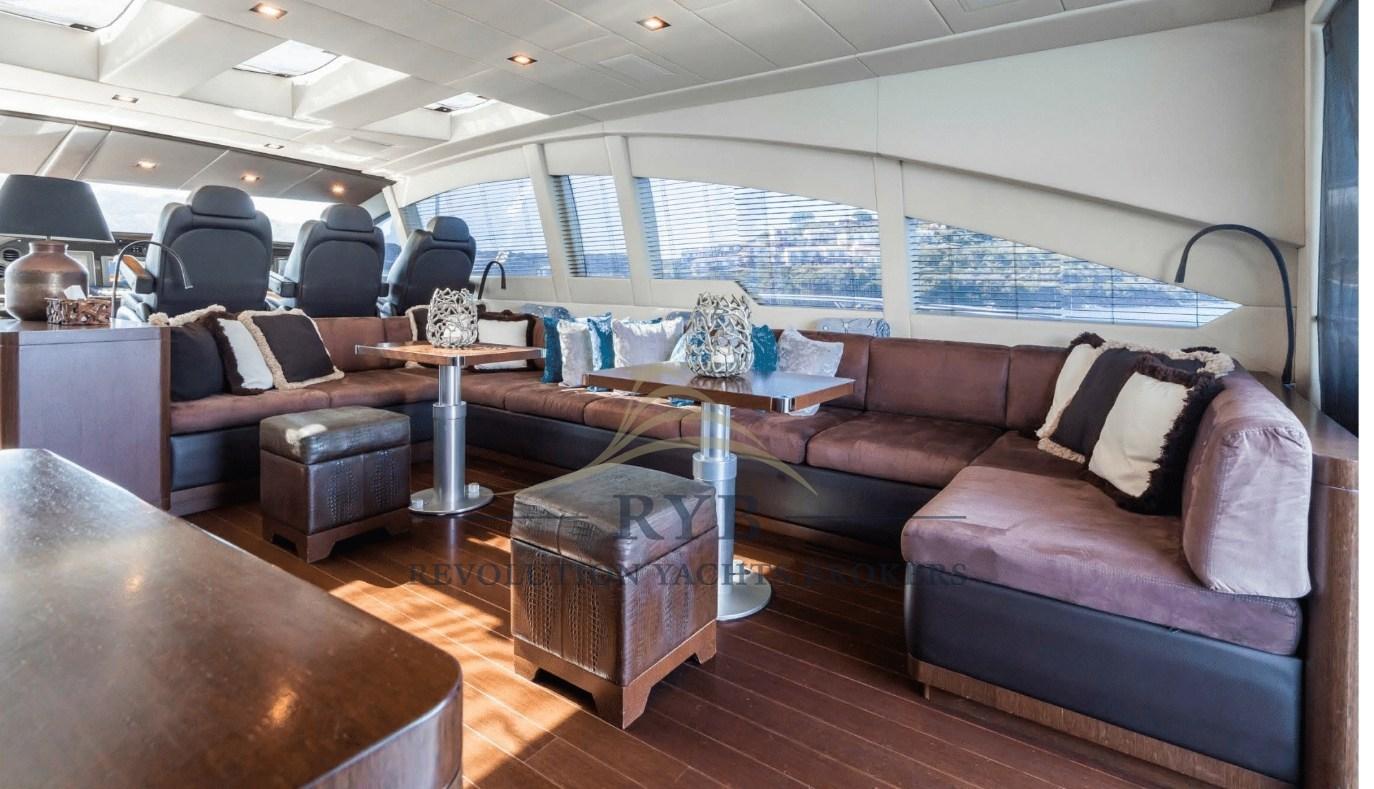 Fume/Gas Detector, Engine Alarm, Bilge Alarm, Water pressure pump, Teak Side Decks, Deck Shower, Directional Spotlight, Hydraulic Flaps, Tender Garage, Hard top, Fire Extinguishing System, Compressor Air System, Flaps Indicators, Anchor Chain Washdown, Washbasin in the cockpit, Courtesy Lights, Underwater lights, Gangway, Platform (TRANSFORMER), Automatic Bilge Pump, Manual Bilge Pump, Entry door, Side door, Teak Cockpit, Shorepower connector, Water harbor connector system, Voltage Rectifier, Rollbar, Electric Windlass, swimming ladder, Saddles for tender, 2 cockpit table, Living Room Foldable Table, Tender (WILLIAMS 380), Horn, 2 Stern Winches, Bow Winches.