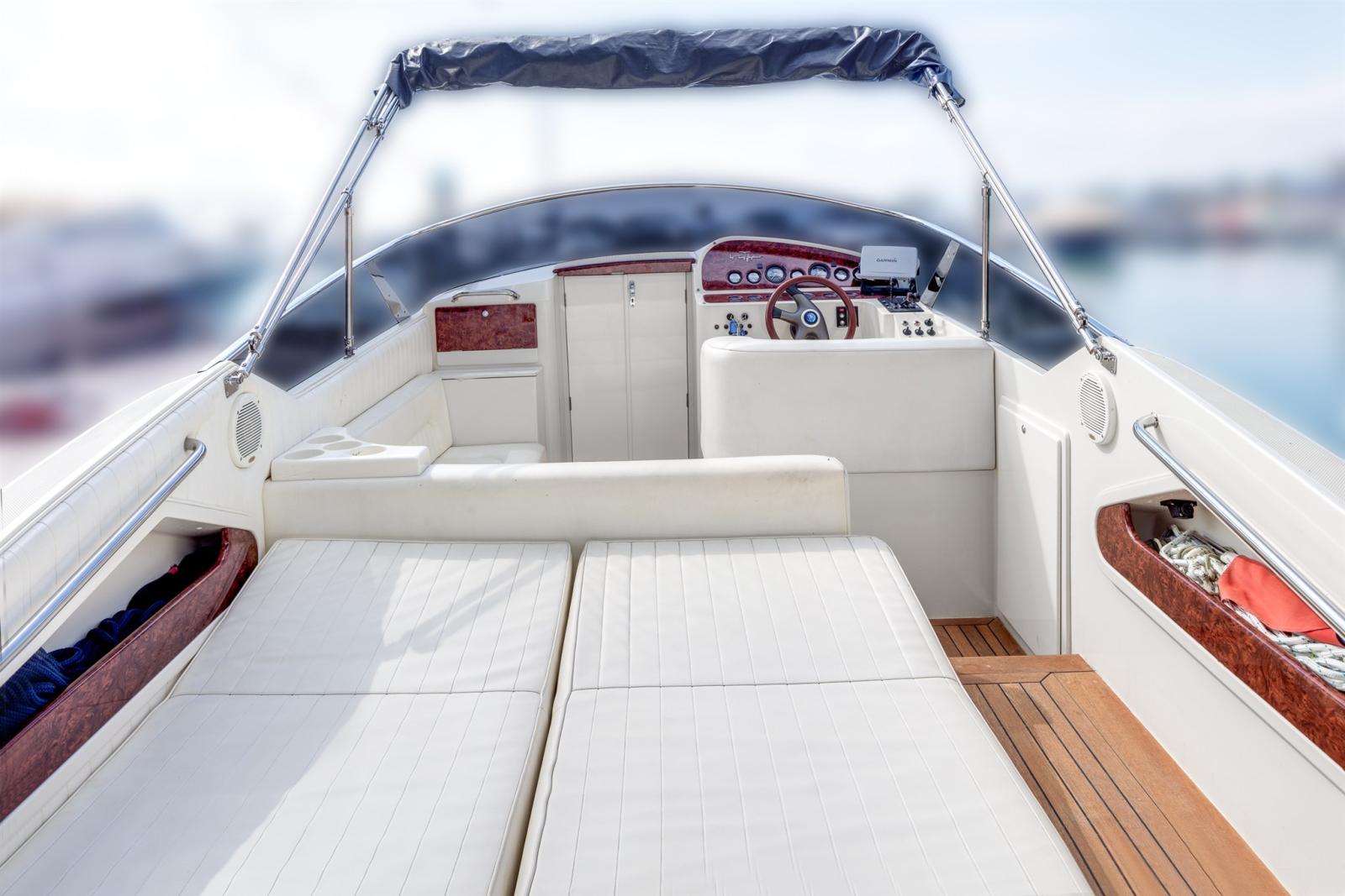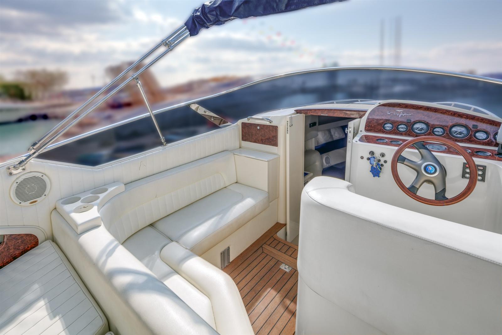 The cockpit is equipped with a helm station and corner sofa, as well as two large sundecks with relative navy blue terry upholstery that reflect the colors of the boat.