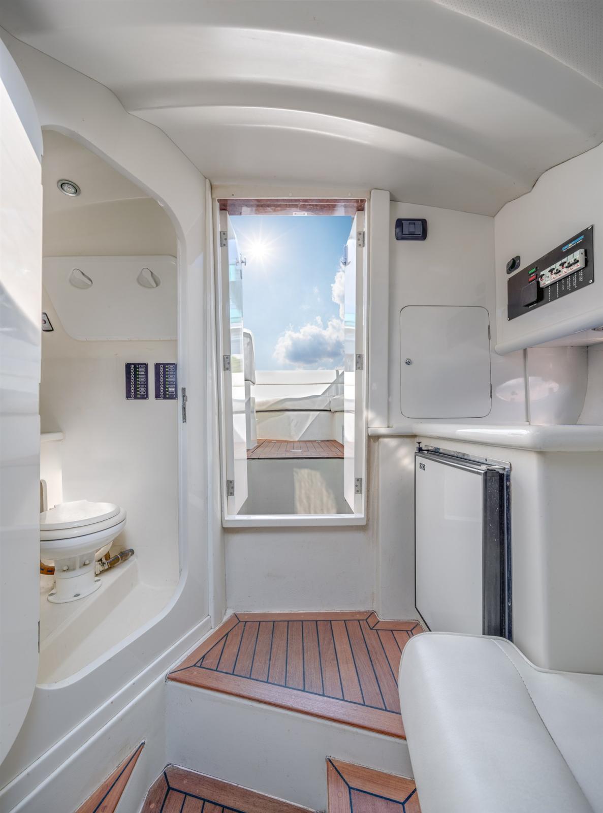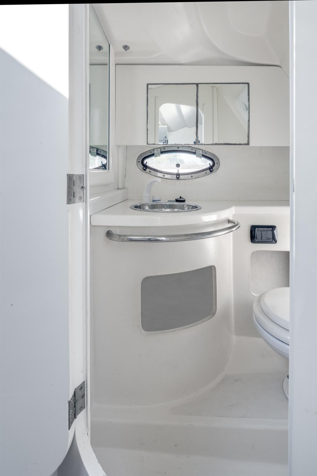 Below deck there is a spacious cabin with interior height that allows you to stand comfortably, a double bed, two side seats (left and right) and a separate toilet with toilet and sink.