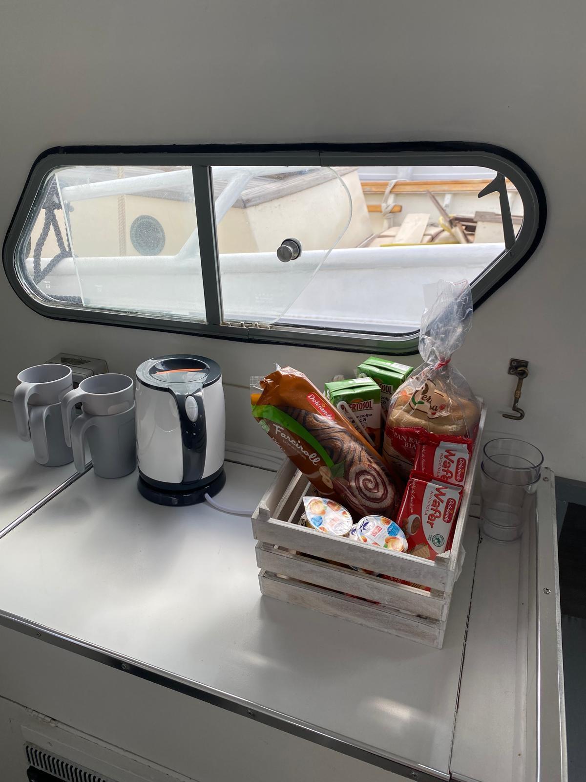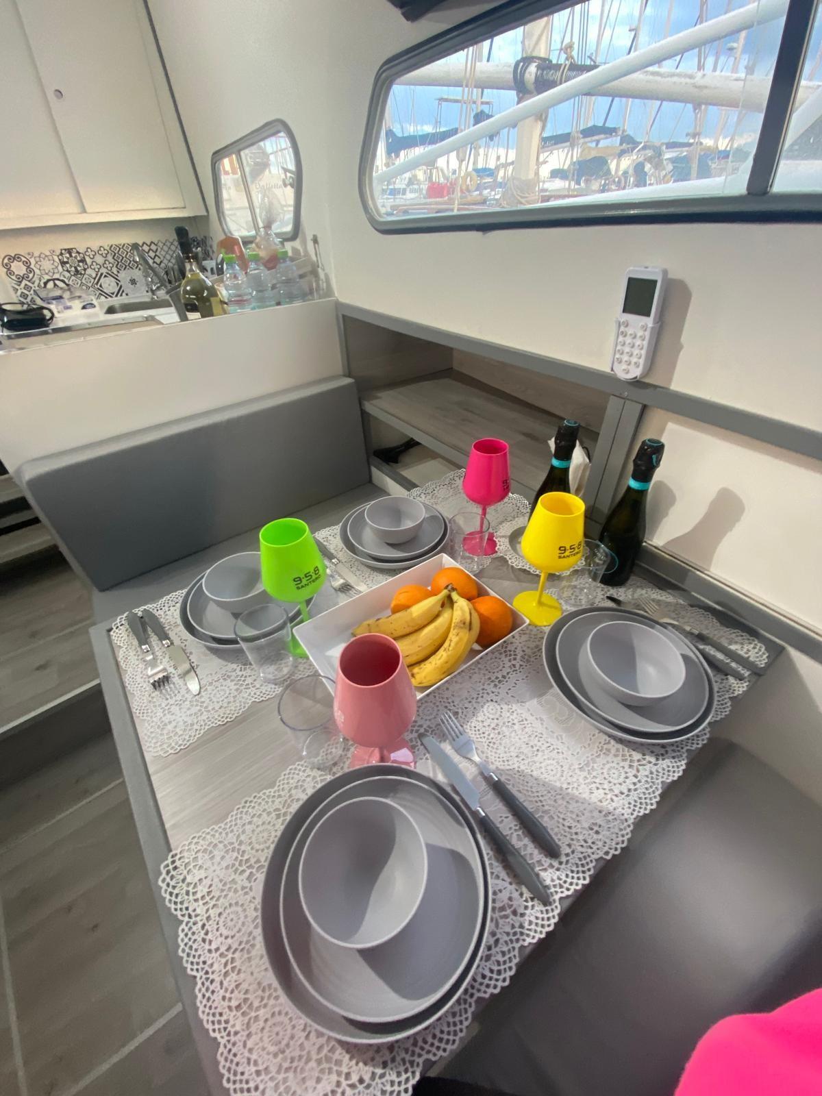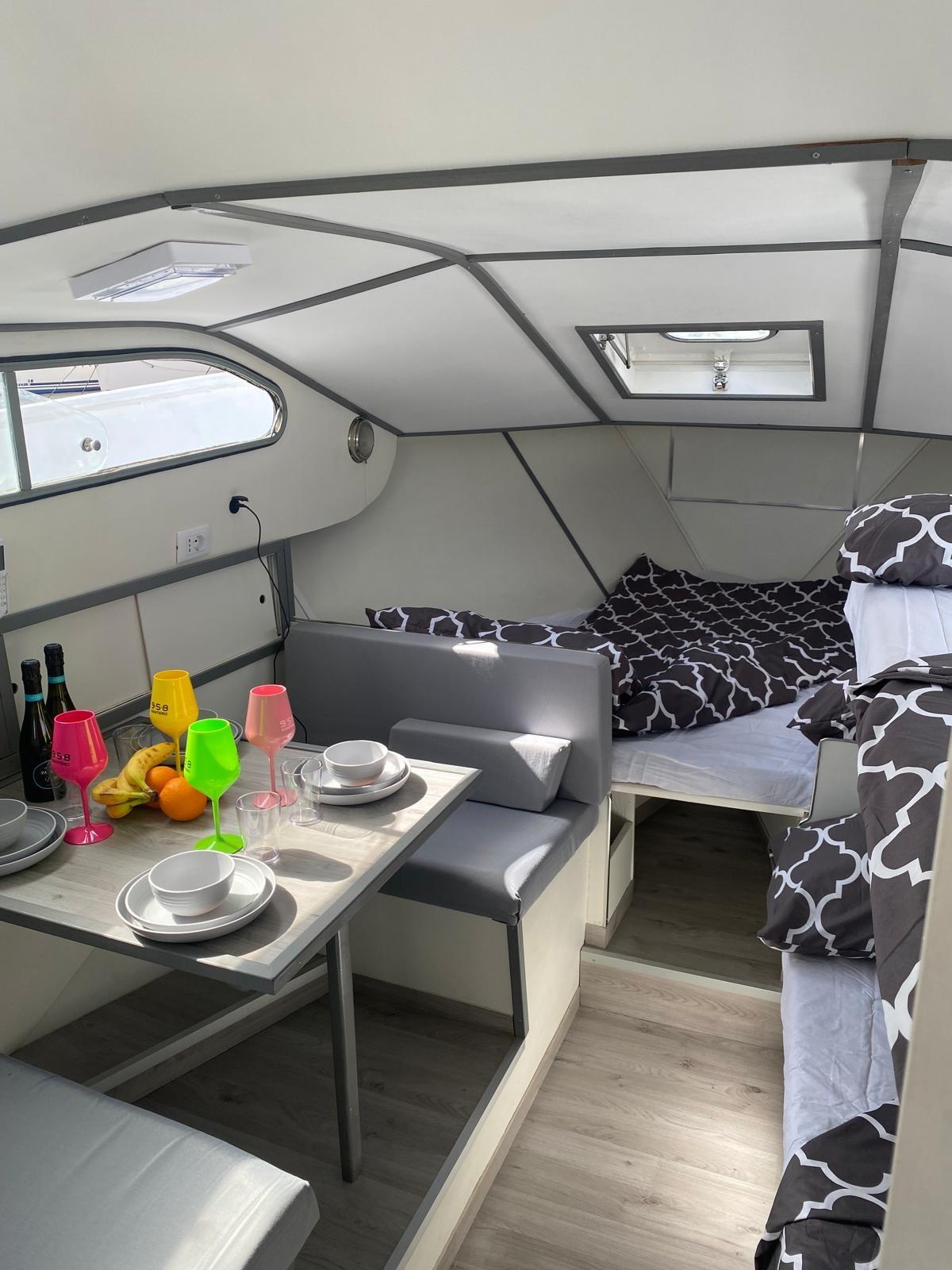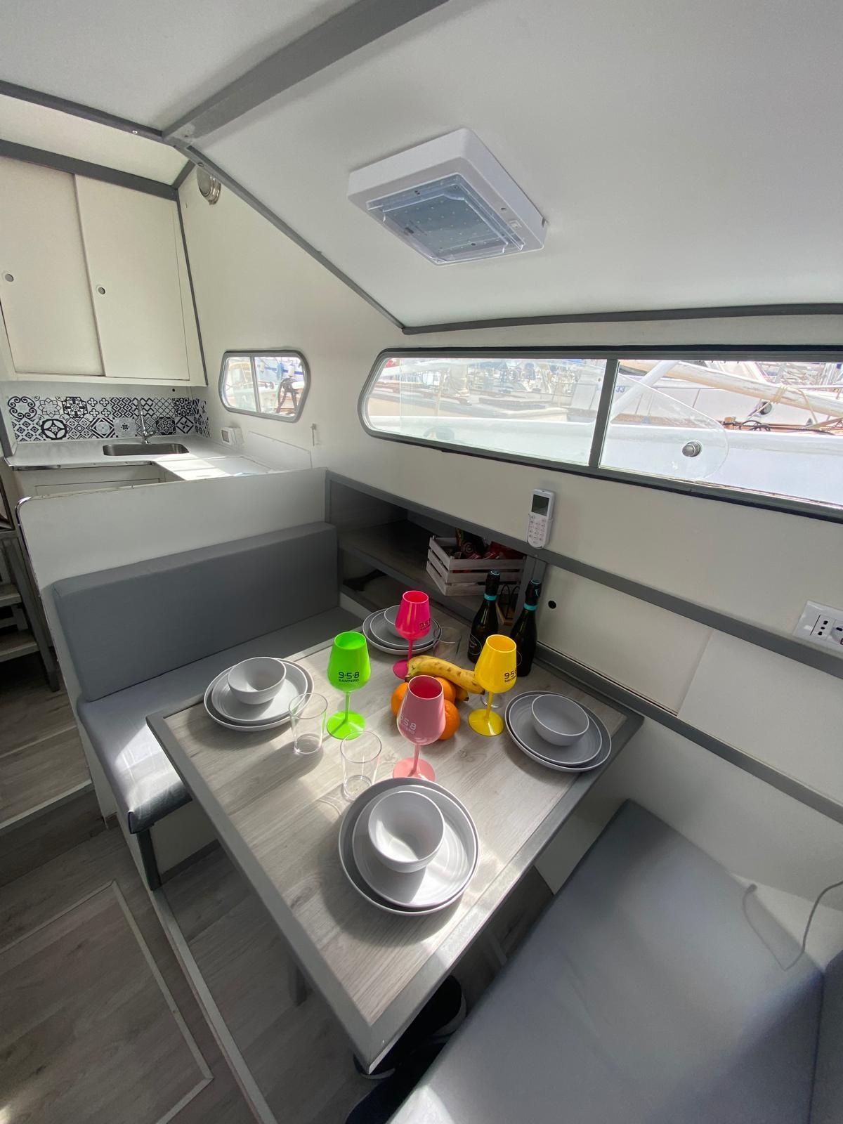 Engine Alarm, Bilge Alarm, Water pressure pump, Shore power cable, Special Colour (Grigio ferro), Deck Shower, Headlights fixed on the stem, Electric Flaps, Flaps Indicators, Courtesy Lights, Platform, Automatic Bilge Pump, Entry door, Open Cockpit, Shorepower connector, Electric Windlass, swimming ladder, Living Room Foldable Table, Horn.