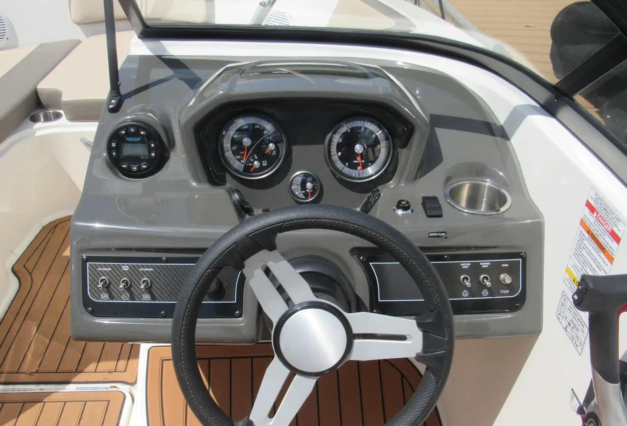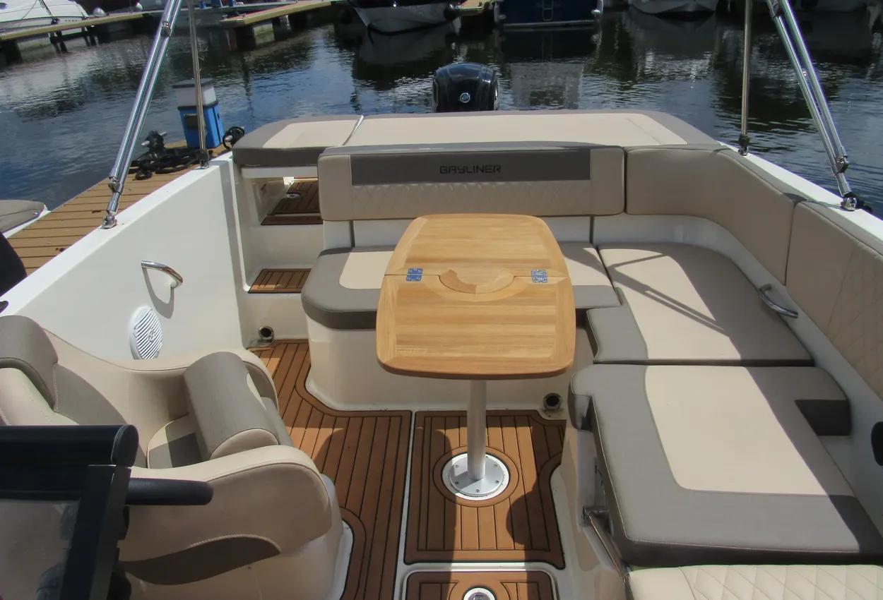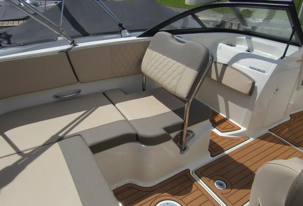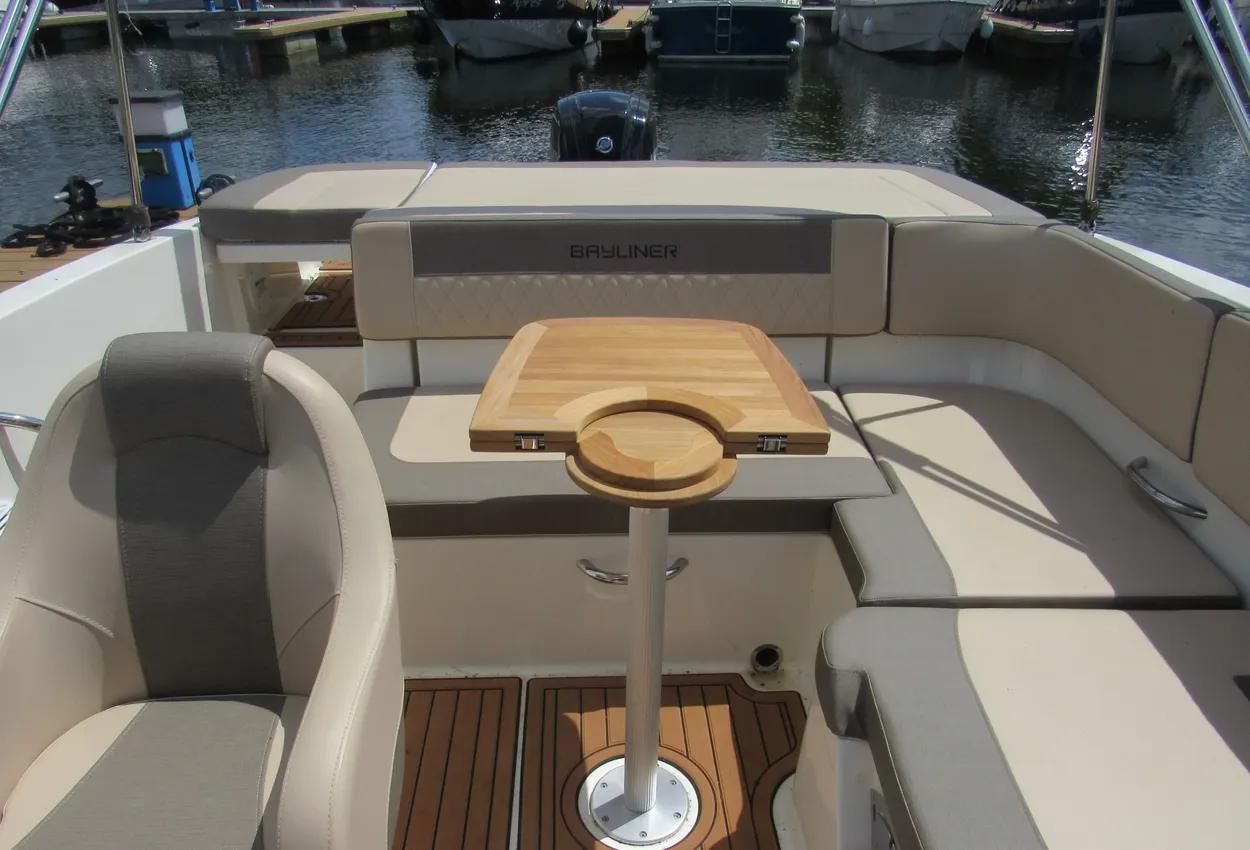 The boat features a BeamForward design with high gunnels, providing more passenger space, under-seat storage, and enhanced safety. The standard integrated swim platform is positioned further aft than comparable models, adding interior space and serving as an ideal staging area for water sports. The cockpit is exceptionally roomy, thanks to Bayliner's exclusive AftAdvantage design.