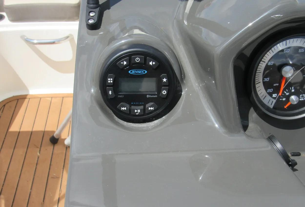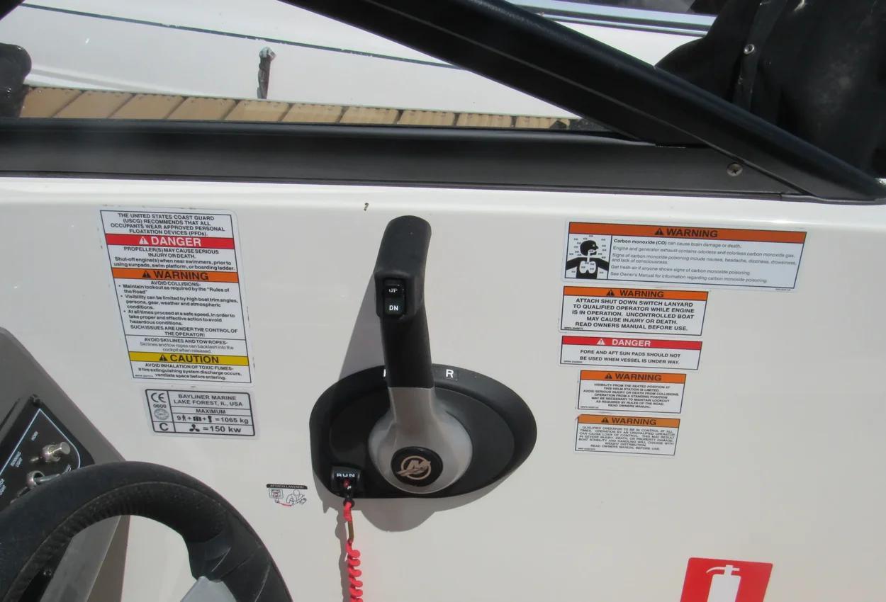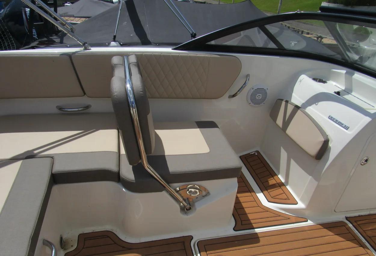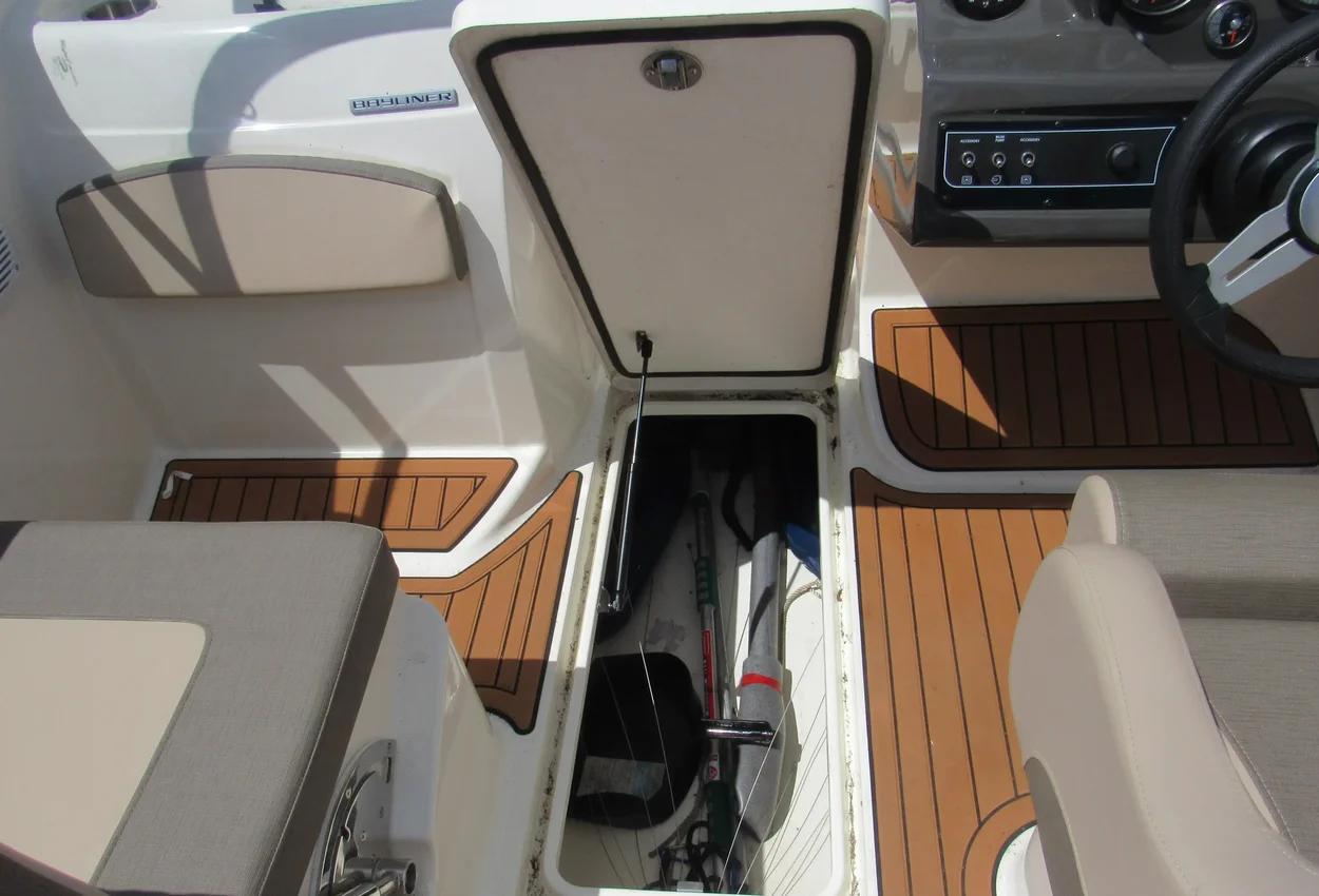 The boat features a BeamForward design with high gunnels, providing more passenger space, under-seat storage, and enhanced safety. The standard integrated swim platform is positioned further aft than comparable models, adding interior space and serving as an ideal staging area for water sports. The cockpit is exceptionally roomy, thanks to Bayliner's exclusive AftAdvantage design.