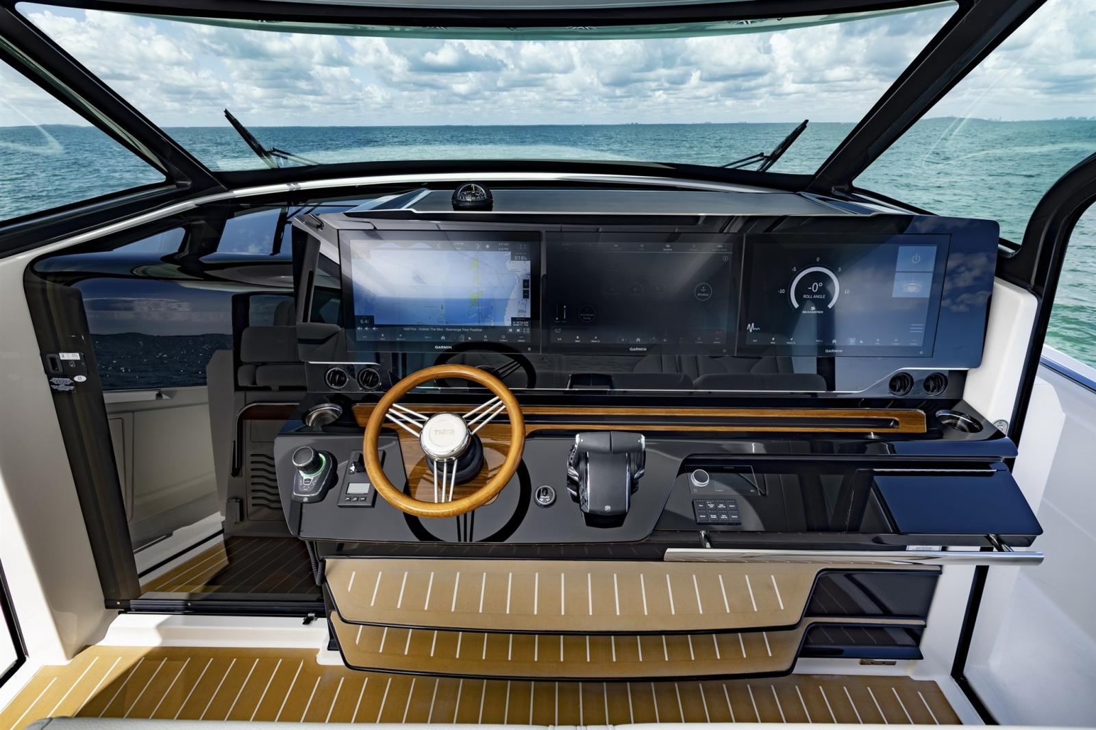 Rudder angle indicator, Radar Antenna (Garmin, Open Array), Compass (Ritchie SuperSport), Electronic engine control (Mercury), On-Board Computer (Mercury), Odometer (Garmin), Depth Sounder (Garmin), GPS (Garmin), Joystick (Mercury JPO), Autopilot (Mercury), 3 Chartplotter (Garmin Touch), VHF Radio (Garmin), Co-pilot seat.